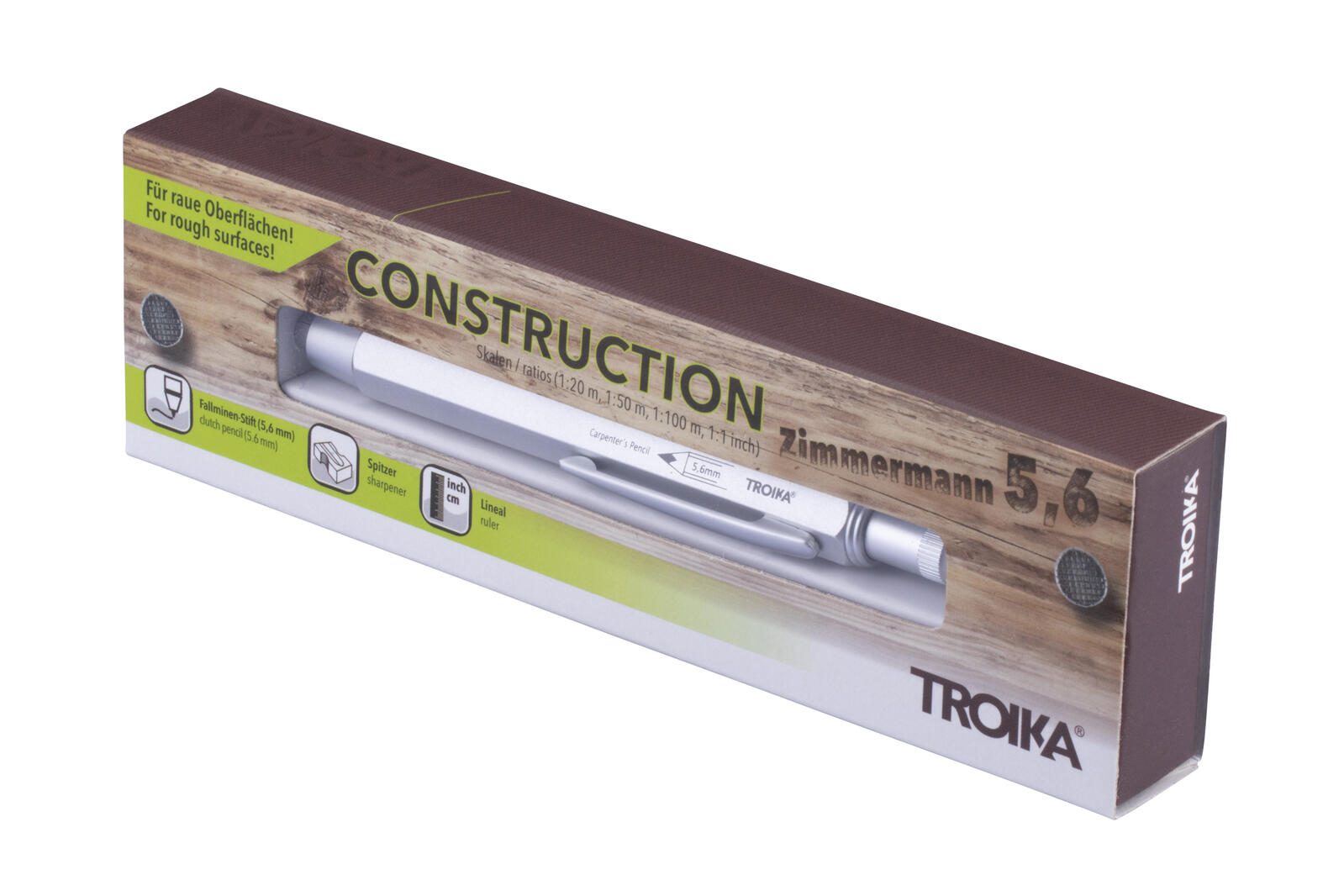 Der TROIKA® Bleistift ZIMMERMANN 5,6 ist ein speziell für Handwerker konzipierter Bleistift, der sich besonders für Zimmerleute, Maurer sowie Beton- und Stahlbetonbauer eignet. Er ist ideal zum Skizzieren und Anreißen auf rauen Oberflächen wie Holz, Stein und Beton. Durch seine robuste Ausführung erfüllt er die Anforderungen in handwerklichen Arbeitsumgebungen zuverlässig.