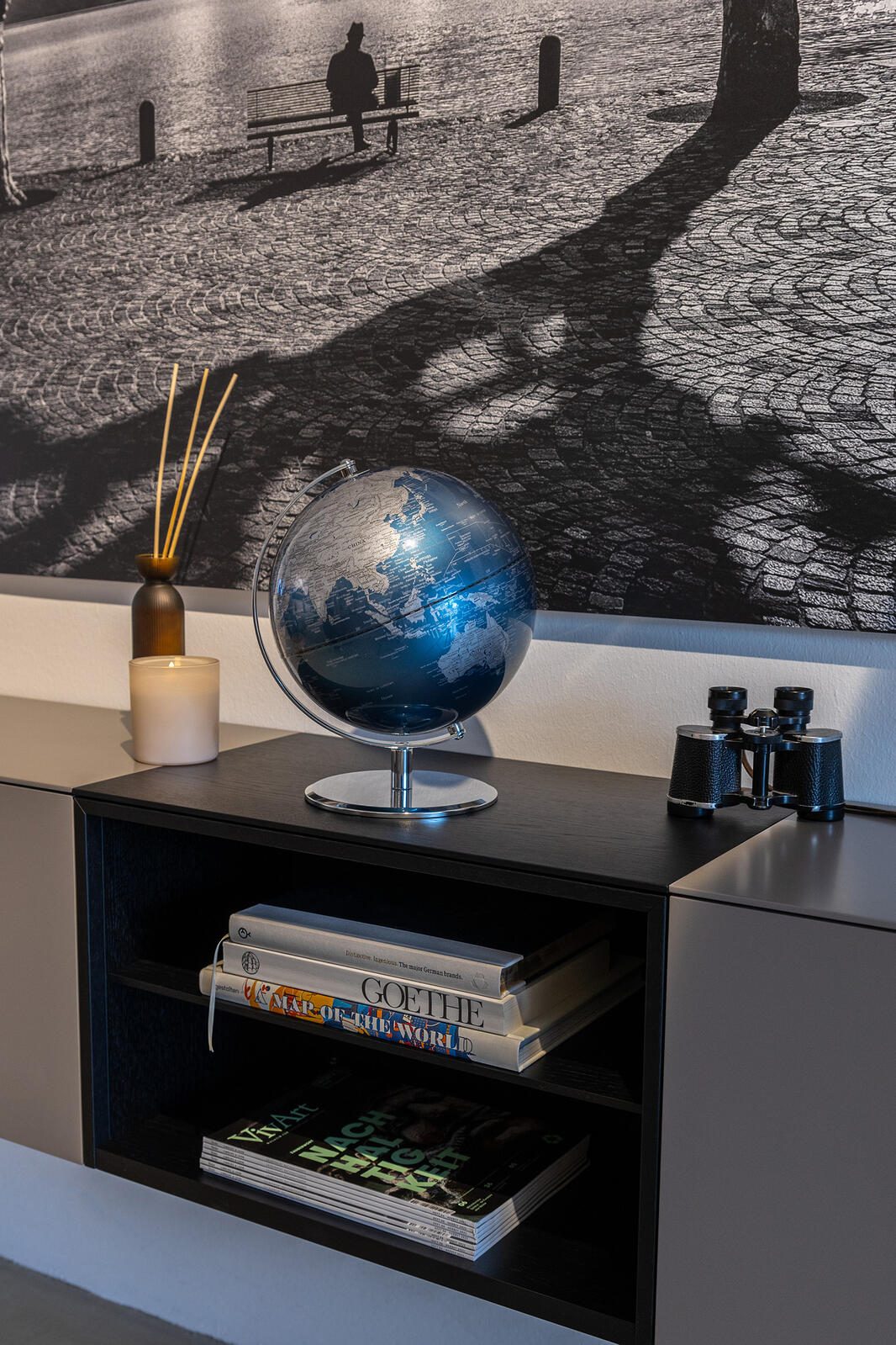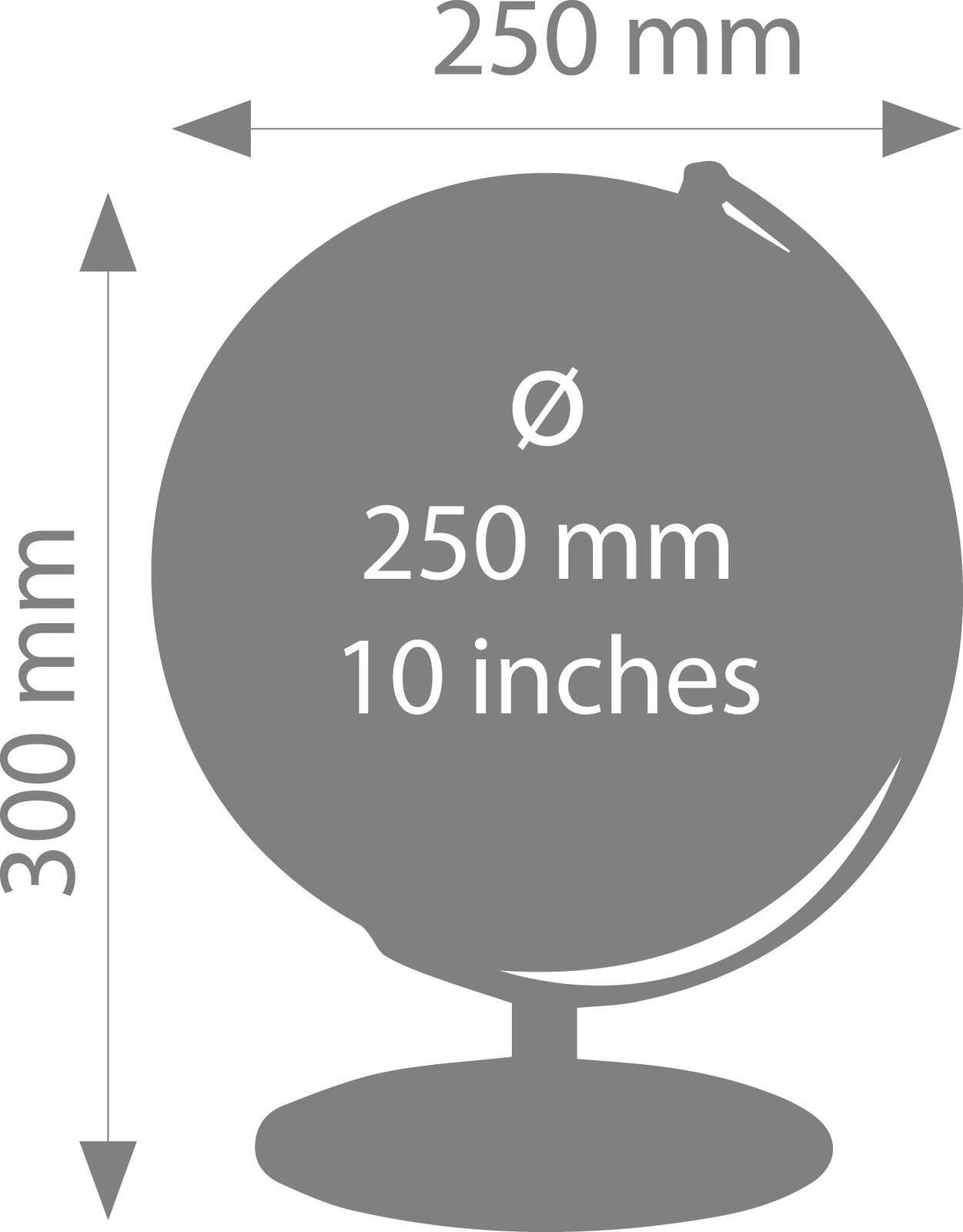 - Besonderheiten : Tischglobus in englischer Sprache, verchromter Metallfuß, mit Filz unterfüttert, bewegliche Achse, glänzend, metallic-blau/silberfarben