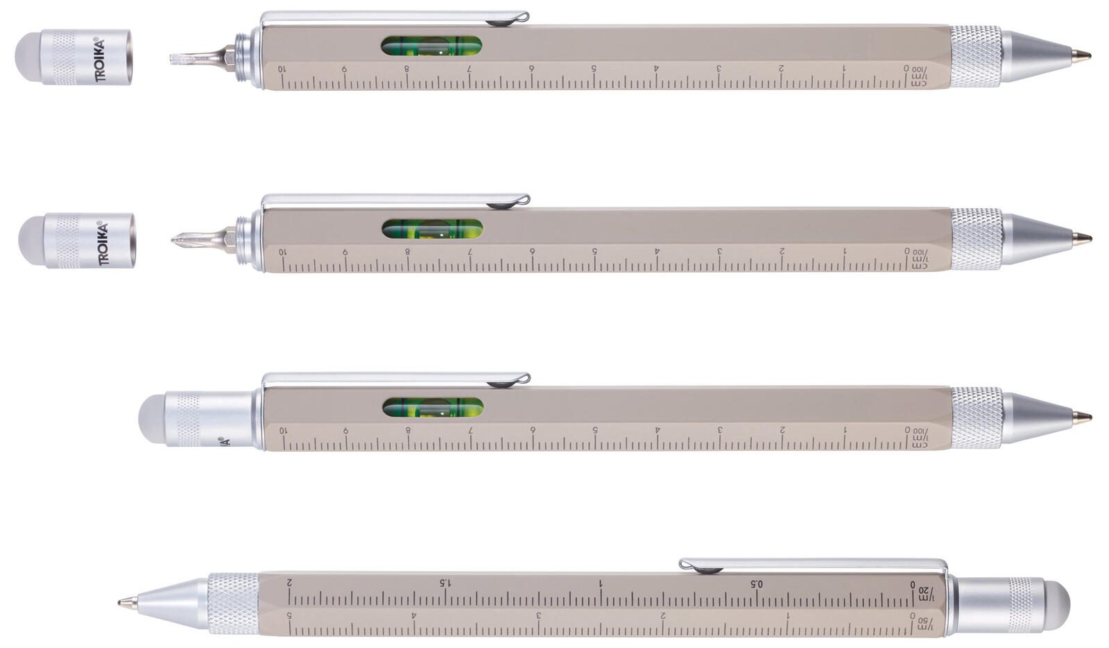 - Multitasking-Kugelschreiber mit verschiedenen Skalen, Zentimeter- und Zoll-Lineal, 1:20 m und 1:50 m Skala, Schlitz-/Kreuzschraubendreher, Stylus und Wasserwaage (Durchmesser: 10 mm), Schreiblänge 1600 bis 1800 m