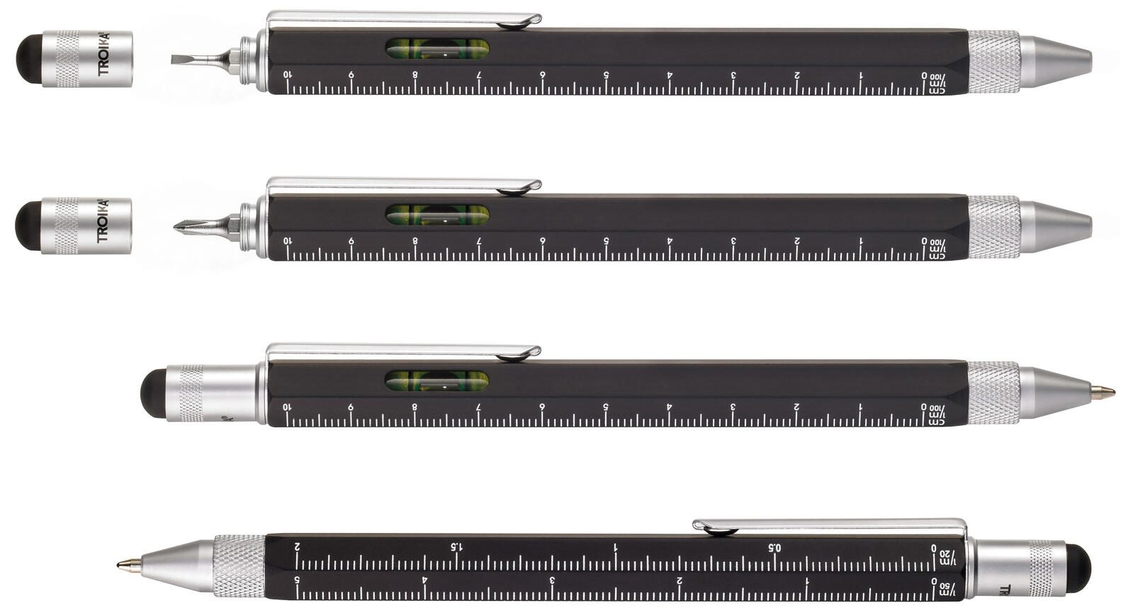 - Multitasking-Kugelschreiber mit verschiedenen Skalen, Zentimeter- und Zoll-Lineal, 1:20 m und 1:50 m Skala, Schlitz-/Kreuzschraubendreher, Stylus und Wasserwaage (Durchmesser: 10 mm), Schreiblänge 1600 bis 1800 m