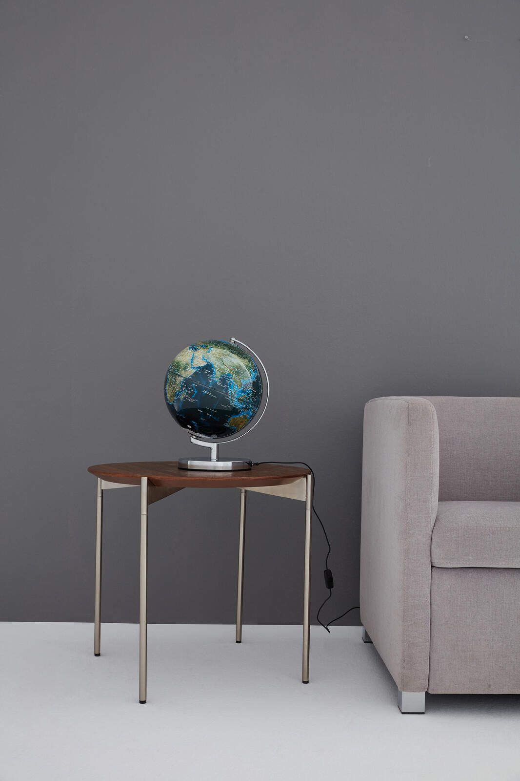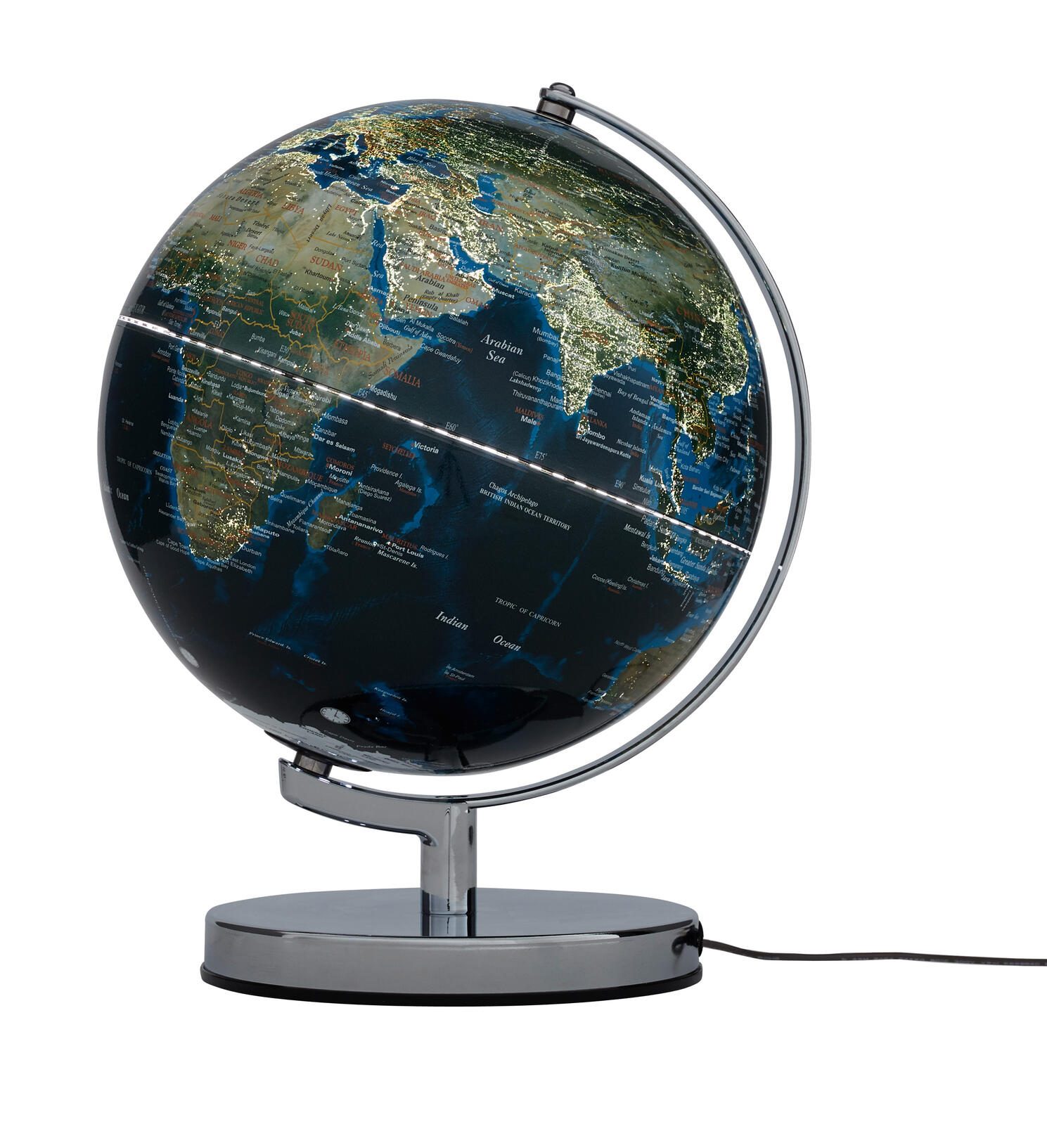 - Besonderheiten : LED-Leuchtglobus, integrierte LED-Beleuchtung mit warmem Licht, drehbar auf einem stabilen verchromten Metallfuß, bewegliche Achse, in englischer Sprache betitelt, schwarzes Kabel mit Eurostecker und Schalter