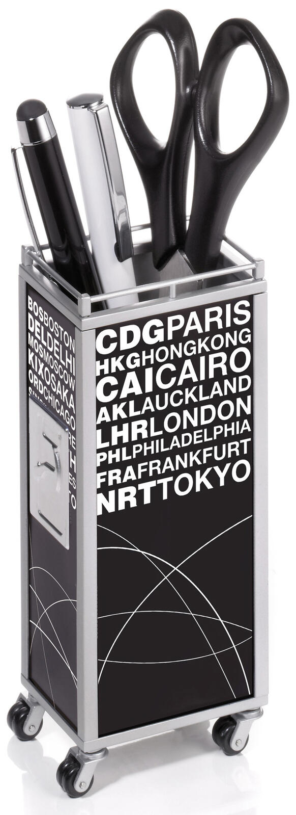- Ausführung: Stiftehalter im Design eines Flugzeugtrolleys, mit beweglichen Rädern