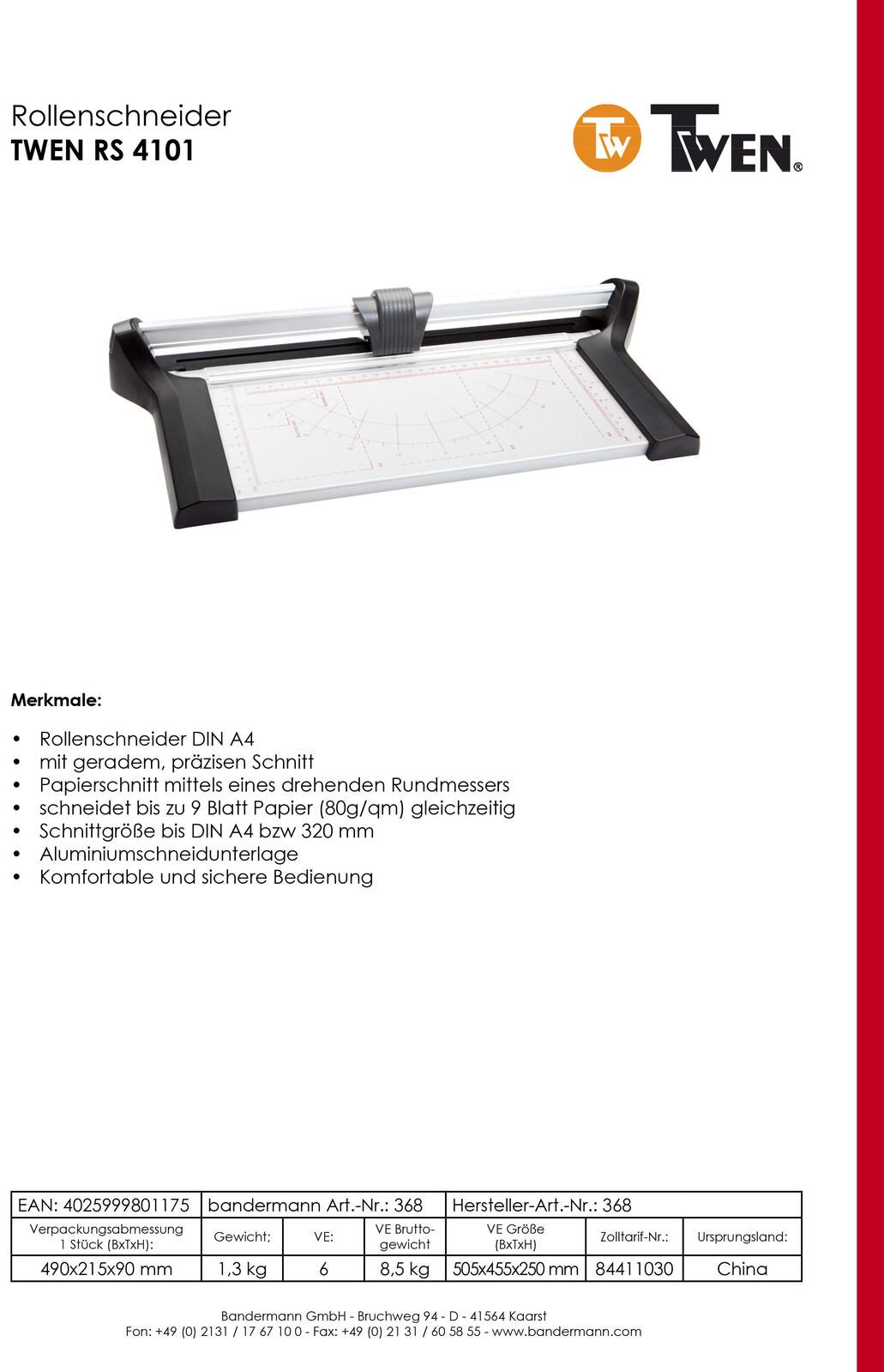 Der TWEN Rollenschneider für DIN A4 ist das ideale Werkzeug für alle, die präzise und saubere Schnitte benötigen. In einem eleganten Silber gehalten, kombiniert dieser Rollenschneider Funktionalität mit ansprechendem Design. Die hochwertige Verarbeitung der Schneideunterlage aus Metall gewährleistet eine lange Lebensdauer und Stabilität, während die Kombination aus Metall und Kunststoff für ein geringes Gewicht und eine benutzerfreundliche Handhabung sorgt. Mit einer speziellen Konstruktion, die für das Format DIN A4 optimiert ist, ermöglicht der TWEN Rollenschneider exakte Schnitte in Papier, Fotopapier und anderen Materialien. Dies macht ihn zu einem unverzichtbaren Hilfsmittel für Büroarbeiten, kreative Projekte oder das Basteln zu Hause. Die scharfe Klinge sorgt dafür, dass Sie auch dickere Materialien mühelos durchtrennen können, ohne dass dabei die Kanten ausfransen. Die Benutzerfreundlichkeit des TWEN Rollenschneiders wird durch seine durchdachte Ergonomie unterstützt. Die Handhabung ist intuitiv, sodass auch Anfänger schnell mit dem Gerät vertraut werden. Dank seiner kompakten Größe lässt sich der Rollenschneider leicht verstauen und transportieren, was ihn perfekt für den Einsatz im Büro, in der Schule oder zu Hause macht. Zusammenfassend ist der TWEN Rollenschneider für DIN A4 eine ausgezeichnete Wahl für alle, die Wert auf Präzision und Qualität legen. Er bietet nicht nur eine effektive Lösung für Ihre Schneidbedürfnisse, sondern überzeugt auch durch seine ansprechende Optik und robuste Bauweise. Genießen Sie die Vorteile eines professionellen Werkzeugs, das Ihnen hilft, Ihre kreativen Ideen in die Tat umzusetzen.