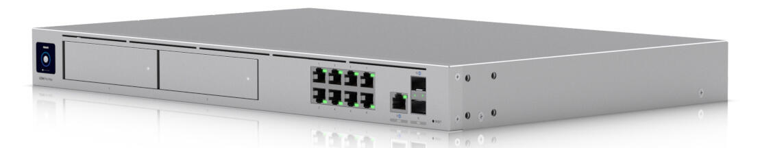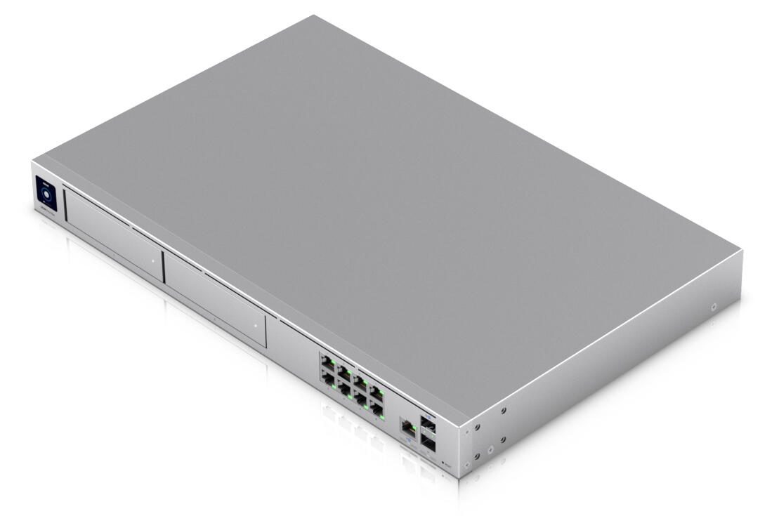 • 10G Cloud Gateway mit Unterstützung für über 200 UniFi-Geräte/über 2.000 Clients, 5 Gbit/s IPS-Routing und redundantem NVR-Speicher.