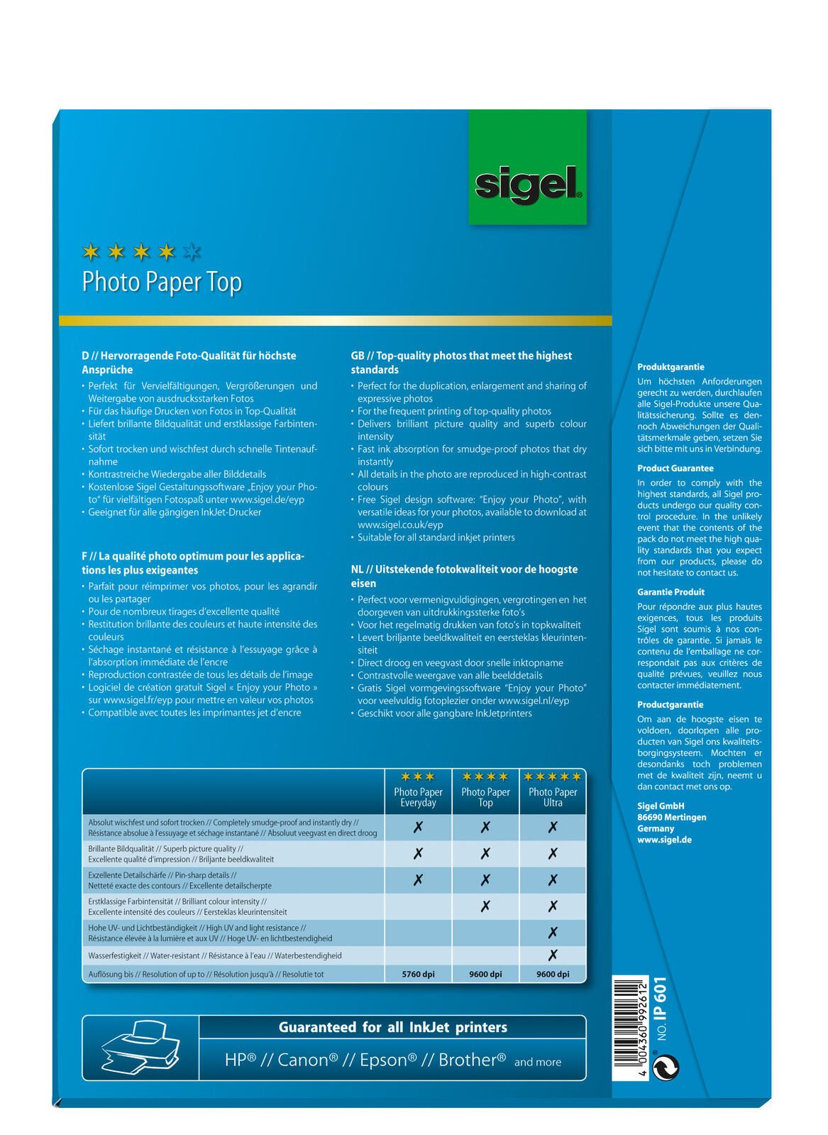 Entdecke die Möglichkeiten, die dir das SIGEL Fotopapier Ultra bietet, und genieße die hohe Qualität deiner Druckergebnisse. Die Kombination aus hochwertigem Material und beeindruckender Farbbrillanz macht dieses Fotopapier zu einem unverzichtbaren Begleiter für alle Fotografie-Enthusiasten.