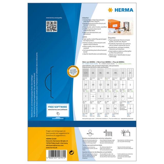Die HERMA Etiketten 8690 in der Größe 148,5 x 205,0 mm bieten eine ideale Lösung für alle, die hochwertige, selbstklebende Etiketten benötigen. Mit einer Packungsgröße von 400 Etiketten pro Pack sind diese vielseitigen Universaletiketten perfekt für den täglichen Gebrauch im Büro, zu Hause oder in der Schule. Die Etiketten sind aus hochwertigem, chlorfrei gebleichtem Papier gefertigt, was sie umweltfreundlich und nachhaltig macht. Die rechteckige Form und die matte Oberfläche der Etiketten ermöglichen eine klare und präzise Beschriftung, egal ob du einen Inkjet-Drucker, Kopierer oder einen Schwarz-Weiß-Laser verwendest. Die Etiketten sind nicht blickdicht, was bedeutet, dass sie sich ideal für die Kennzeichnung von transparenten oder farbigen Oberflächen eignen. Ihre Größe von 148,5 x 205,0 mm macht sie besonders vielseitig – perfekt für Adressetiketten, Produktetiketten oder organisatorische Zwecke. Ein weiterer Vorteil ist die selbstklebende Eigenschaft, die eine einfache Anwendung ermöglicht. Du kannst die Etiketten mühelos auf eine Vielzahl von Oberflächen anbringen, ohne dass zusätzliche Klebstoffe erforderlich sind. Dank der hochwertigen Verarbeitung sind sie langlebig und halten auch unter verschiedenen Bedingungen gut. Die HERMA Etiketten 8690 sind nicht ablösbar, was sie ideal für dauerhafte Beschriftungen macht. Sie verfügen über abgerundete Ecken, die ein Verknicken und Abblättern an den Kanten verhindern. Zudem sind sie lösemittelfrei, was sie zu einer sicheren Wahl für den Einsatz in Schulen oder Büros macht. Mit den HERMA Etiketten 8690 erhältst du eine zuverlässige und vielseitige Lösung für all deine Beschriftungsbedürfnisse.Technische Daten