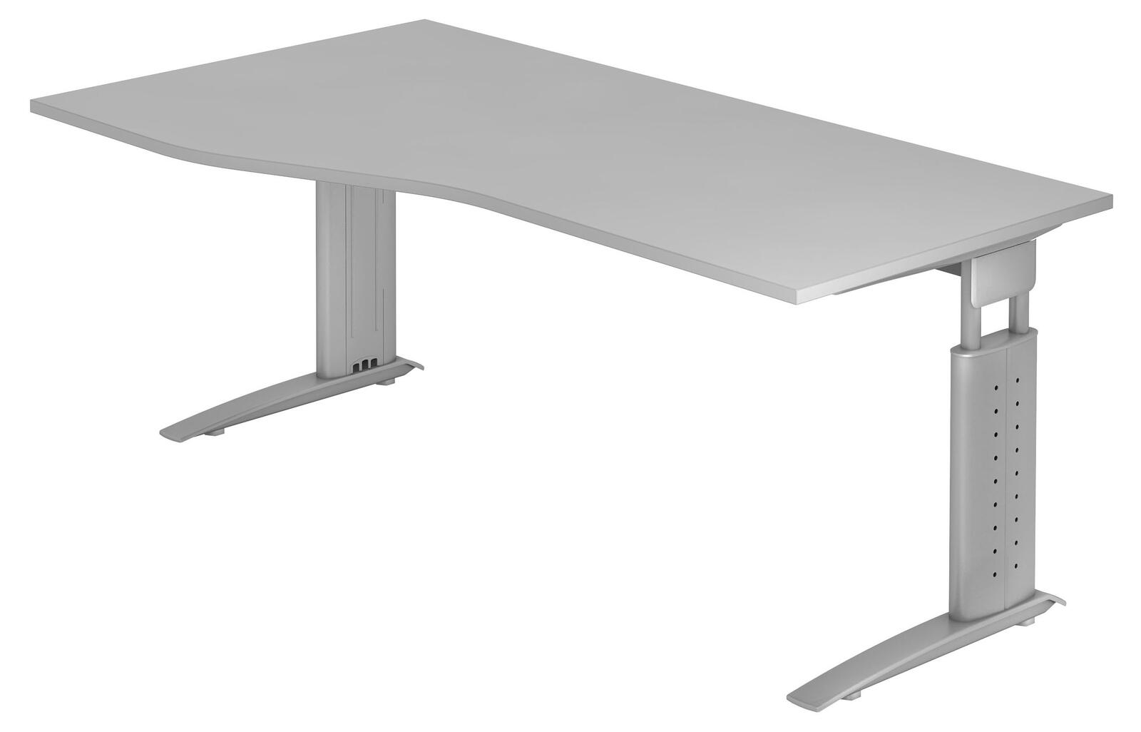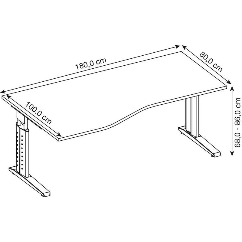 Der HAMMERBACHER VUS18/5/S ist ein höhenverstellbarer Schreibtisch, der sich ideal für moderne Arbeitsumgebungen eignet. Mit einer flexiblen Höhenverstellung von 68 bis 86 cm passt er sich Ihren individuellen Bedürfnissen an und fördert eine ergonomische Haltung. Die elegante Farbgestaltung in lichtgrau und silber verleiht Ihrem Arbeitsplatz eine zeitgemäße und stilvolle Note. Die Tischplatte besteht aus hochwertiger Spanplatte, die nicht nur robust, sondern auch pflegeleicht ist. Das stabile C-Fuß-Gestell aus Stahl sorgt für eine ausgezeichnete Standfestigkeit und Langlebigkeit. Diese Kombination aus hochwertigen Materialien garantiert Ihnen einen Schreibtisch, der sowohl funktional als auch ästhetisch ansprechend ist. Die trapezförmige Tischplatte bietet Ihnen ausreichend Platz für Ihre Arbeitsutensilien und sorgt gleichzeitig für eine optimale Raumausnutzung. Da der Schreibtisch keine zusätzlichen Fächer oder Schübe hat, bleibt die Fläche klar und übersichtlich, was Ihnen hilft, sich besser zu konzentrieren. Die Höhenverstellbarkeit des Schreibtisches fördert nicht nur die Gesundheit, sondern steigert auch Ihre Produktivität. Sie können zwischen Sitzen und Stehen wechseln, was die Durchblutung fördert und Rückenschmerzen vorbeugt. Dieser Schreibtisch ist somit eine sinnvolle Investition in Ihr Wohlbefinden am Arbeitsplatz. Der HAMMERBACHER VUS18/5/S ist nicht nur funktional, sondern auch ein echter Blickfang in jedem Büro oder Homeoffice. Mit seiner modernen Optik und der praktischen Höhenverstellung stellt er sicher, dass Sie stets in der besten Position arbeiten können.Technische Daten