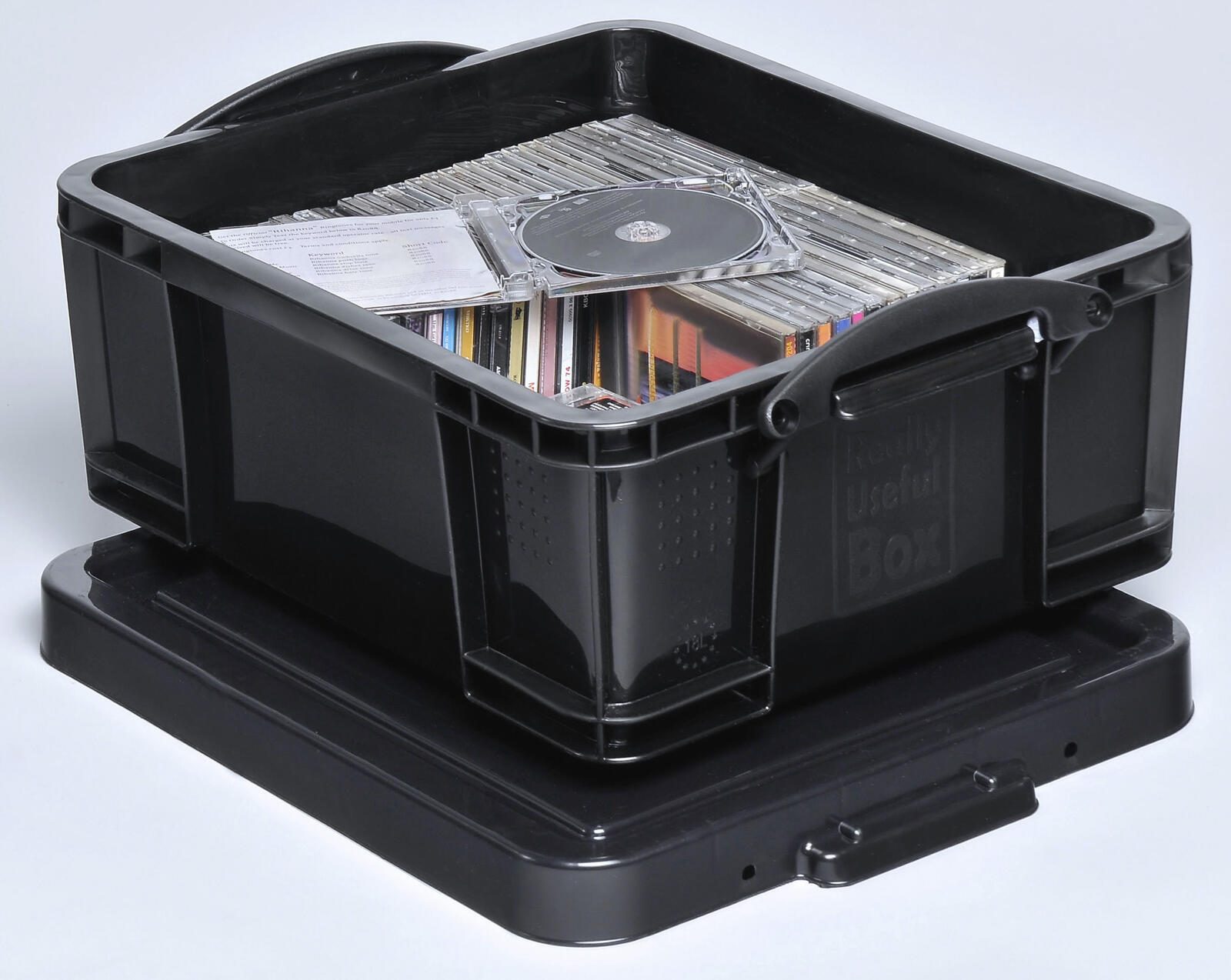 Die Really Useful Box Aufbewahrungsbox mit einem Fassungsvermögen von 18,0 Litern bietet eine praktische und stilvolle Lösung zur Aufbewahrung deiner Gegenstände. Mit den Außenmaßen von 48,0 x 39,0 x 20,0 cm ist sie ideal für die Organisation von CDs und DVDs, sodass du deine Sammlung ordentlich und übersichtlich verstauen kannst. Hergestellt aus robustem Polypropylen, zeichnet sich die Box durch ihre Langlebigkeit und Stabilität aus. Die schwarze Farbe verleiht der Aufbewahrungsbox ein modernes und elegantes Erscheinungsbild, das sich nahtlos in jede Umgebung einfügt. Der vorhandene Deckel schützt den Inhalt vor Staub und Beschädigungen, während die stapelbare Funktion es dir ermöglicht, mehrere Boxen platzsparend übereinander zu lagern. Dies ist besonders vorteilhaft, wenn du wenig Platz zur Verfügung hast und dennoch Ordnung halten möchtest. Die Really Useful Box ist nicht nur funktional, sondern auch vielseitig einsetzbar. Ob im Wohnzimmer, im Büro oder im Schlafzimmer, sie hilft dir dabei, deine Dinge geordnet und griffbereit zu halten. Dank des durchdachten Designs kannst du die Box leicht in Regalen oder Schränken unterbringen, ohne dass sie viel Platz einnimmt. Die robuste Bauweise und die praktische Handhabung machen die Really Useful Box zu einem unverzichtbaren Helfer in deinem Alltag. Sie ist zwar nicht lebensmittelecht und nicht temperaturbeständig, bietet jedoch eine hervorragende Lösung für die Aufbewahrung von nicht empfindlichen Gegenständen. Entdecke die Vorzüge dieser hochwertigen Aufbewahrungsbox und bringe Ordnung in dein Zuhause.Technische Daten
