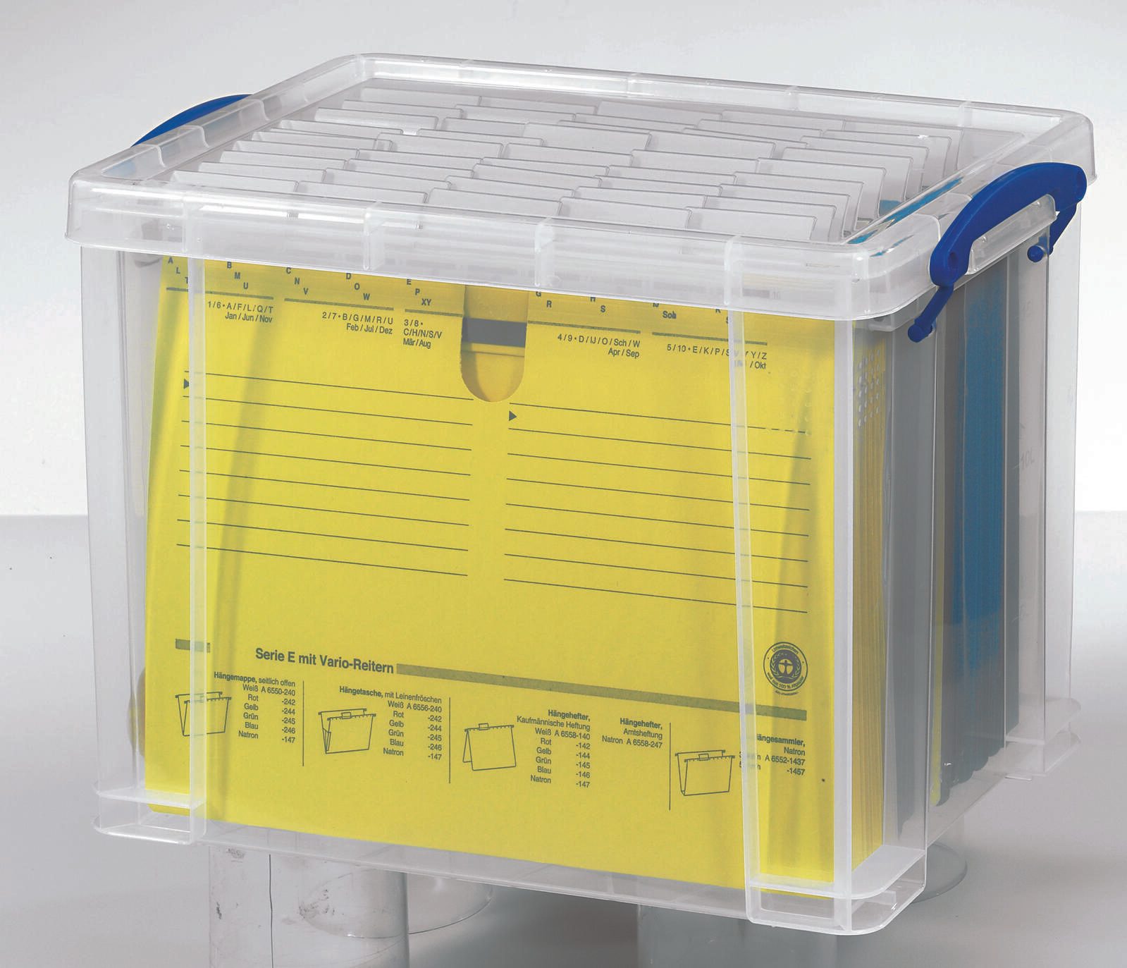 Die Really Useful Box Aufbewahrungsbox mit einem Fassungsvermögen von 19,0 Litern ist die ideale Lösung für deine Aufbewahrungsbedürfnisse. Mit den Außenmaßen von 39,5 x 25,5 x 29,0 cm bietet sie ausreichend Platz für eine Vielzahl von Gegenständen, sei es im Büro, im Haushalt oder beim Hobby. Ihre transparente Farbe ermöglicht es dir, den Inhalt auf einen Blick zu erkennen, was die Organisation erheblich erleichtert. Hergestellt aus hochwertigem, recycelbarem Polypropylen, ist diese Aufbewahrungsbox nicht nur umweltfreundlich, sondern auch besonders robust und langlebig. Der vorhandene Deckel sorgt dafür, dass deine Dinge sicher und staubfrei aufbewahrt werden, während die Stapelbarkeit der Box es dir ermöglicht, den verfügbaren Platz optimal zu nutzen. So kannst du mehrere Boxen übereinander stapeln, ohne dass sie umfallen oder instabil werden. Die Really Useful Box ist speziell geeignet für die Aufbewahrung von Hängemappen, was sie zur perfekten Wahl für dein Büro macht. Auch wenn sie nicht ineinander stapelbar ist, überzeugt sie durch ihre Funktionalität und den praktischen Einsatz. Zudem ist sie nicht lebensmittelecht und sollte daher nicht für die Lagerung von Lebensmitteln verwendet werden. Mit dieser Aufbewahrungsbox erhältst du ein praktisches und stilvolles Produkt, das nicht nur Platz spart, sondern auch für Ordnung sorgt. Egal, ob du Dokumente, Bastelmaterialien oder andere wichtige Dinge unterbringen möchtest, die Really Useful Box ist die optimale Wahl für eine übersichtliche und effiziente Aufbewahrungslösung.Technische Daten