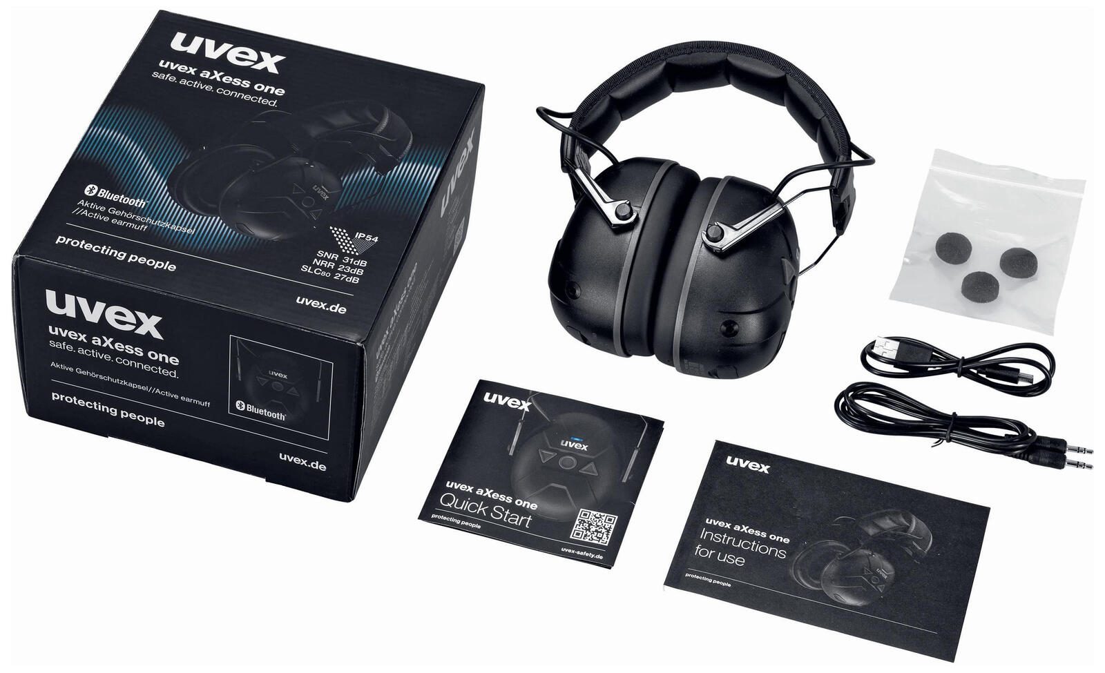 Für die Nutzung moderner Technik verfügt der uvex aXess one über Bluetooth-Verbindungen sowie Anschlüsse für Audioeingang (Line-In) und USB. Damit können externe Audioquellen angeschlossen und wiederaufladbare Akkus verwendet werden. Darüber hinaus ist ein Mikrofon integriert und eine einstellbare Lautstärkebegrenzung sorgt für eine sichere und angenehme Klangwiedergabe. Der uvex Kapselgehörschutz aXess one verbindet somit effektiven Gehörschutz mit komfortabler und moderner Ausstattung.