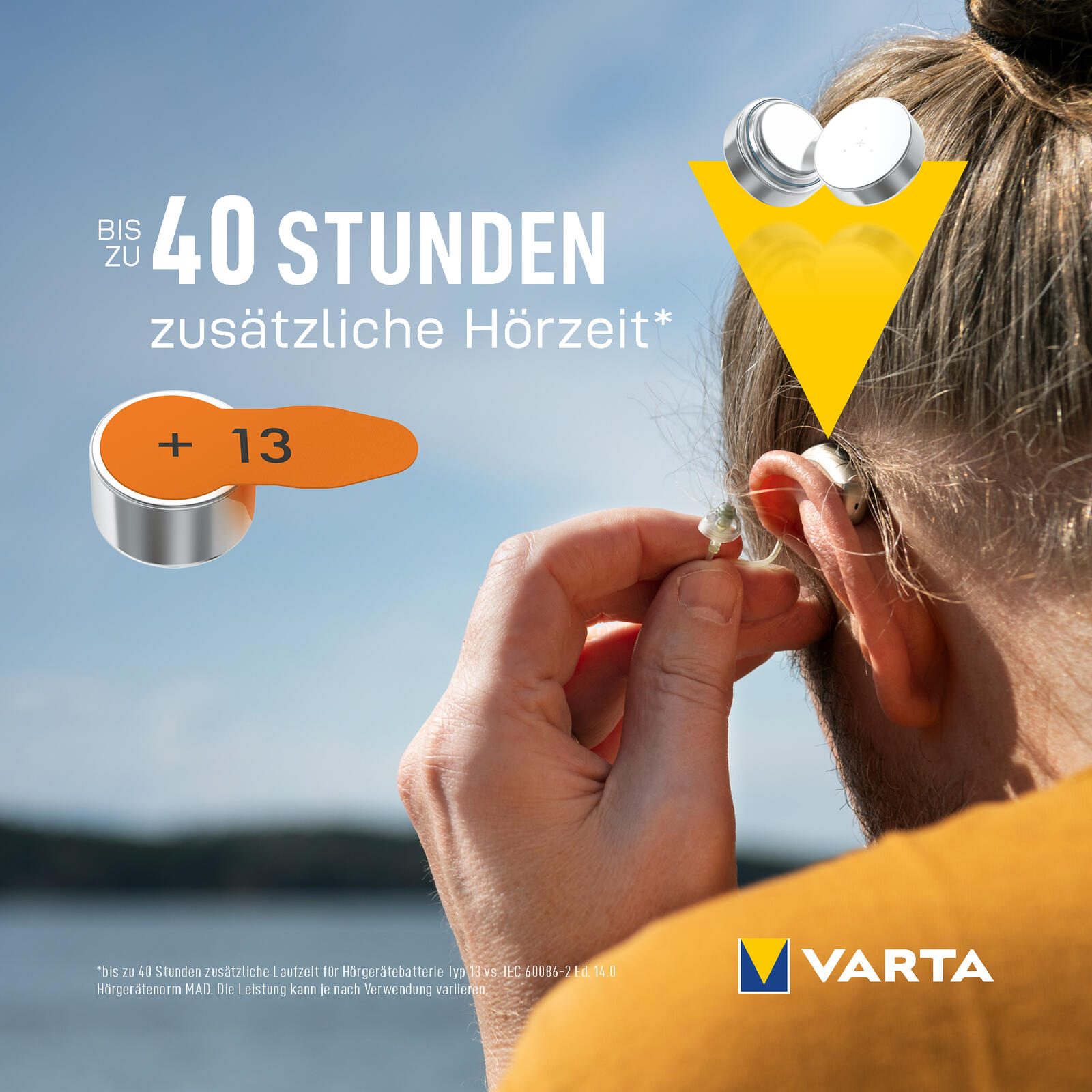 - Bis zu 40 Stunden zusätzliche Laufzeit für Ihr Hörgerät gegenüber IEC 60086-2 Ed. 14,0 Hörgeräte-Normtest MAD. Die Leistung kann je nach Verwendung variieren.