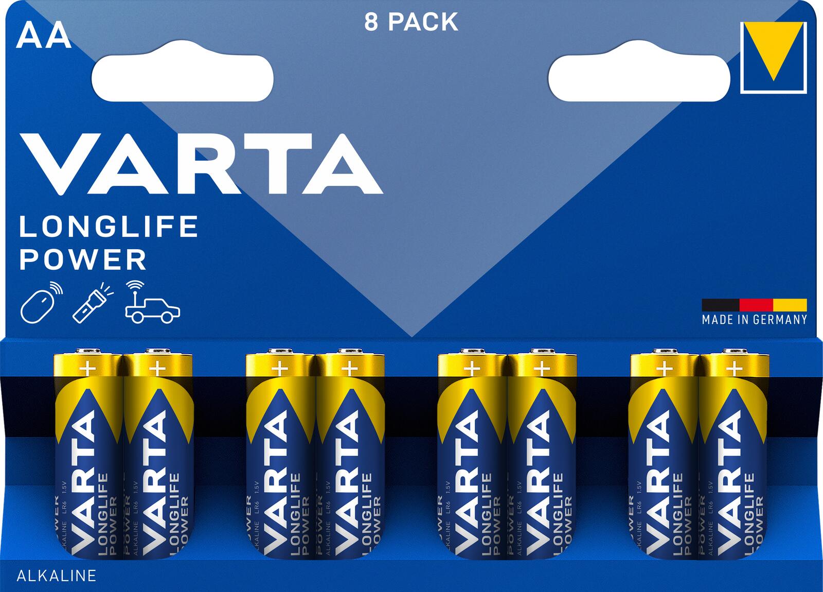 - Lieferumfang: VARTA Longlife Power Mignon (AA) Alkaline Batterie, 8 Stück