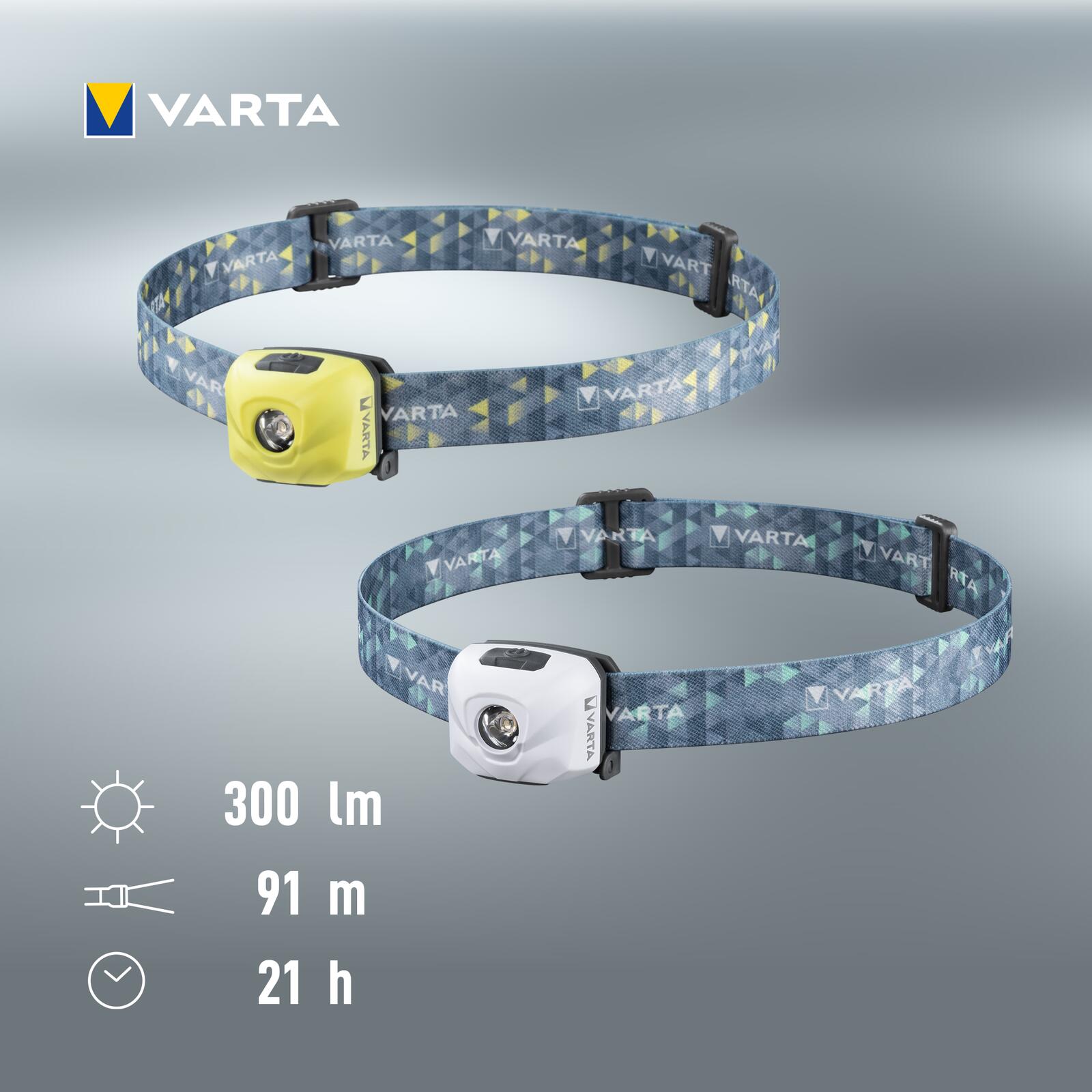 - Die Lichtstärke beträgt bis zu 300 Lumen bei einer Reichweite von bis zu 91 Metern und einer Laufzeit von bis zu 21 Stunden. Reflektierende VARTA-Logos am Kopfband sorgen für bessere Sichtbarkeit und damit Sicherheit beim Einsatz im Dunkeln.