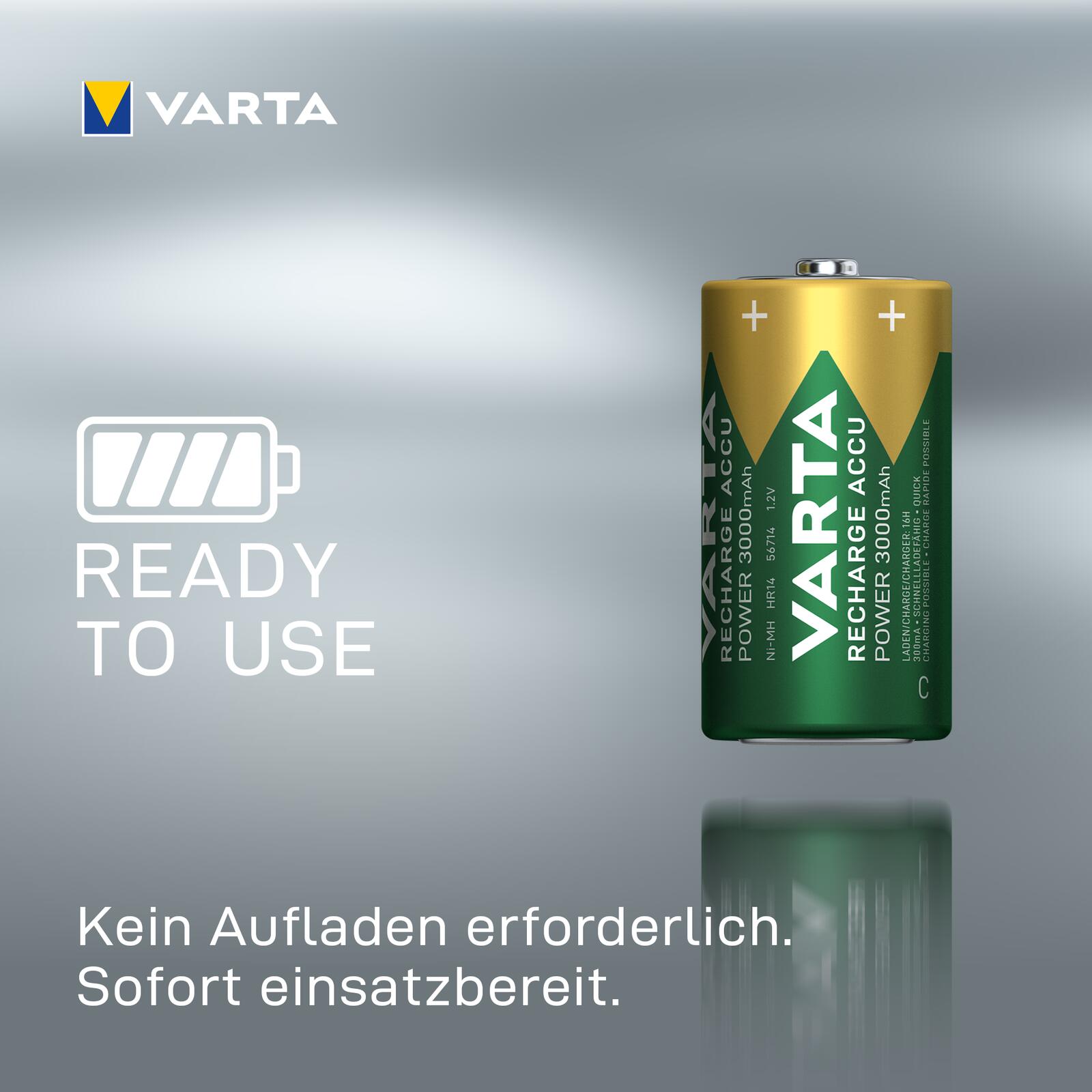 Der VARTA Recharge Accu Power C mit 3000 mAh Kapazität ist "ready to use" für den sofortigen Einsatz direkt aus der Packung und ist die beste Wahl für Ihre Standard- und Smart-Geräte. Sehr geringe Selbstentladung und No-Memory-Effekt sorgen für Haltbarkeit und Langlebigkeit.