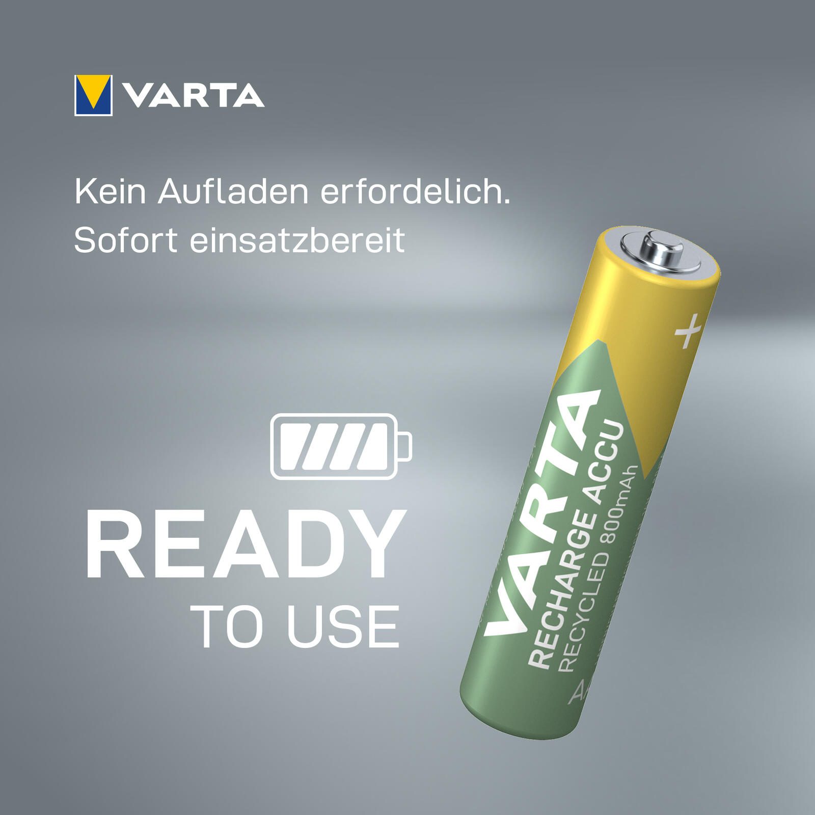 Der VARTA Recharge Accu Recycled AAA mit 800mAh Kapazität besteht zu 25% aus recyceltem Material und ist "ready to use" für den sofortigen Einsatz direkt aus der Packung und ist die beste Wahl für Standard- und Smart-Geräte. Sehr geringe Selbstentladung und kein Memory-Effekt.