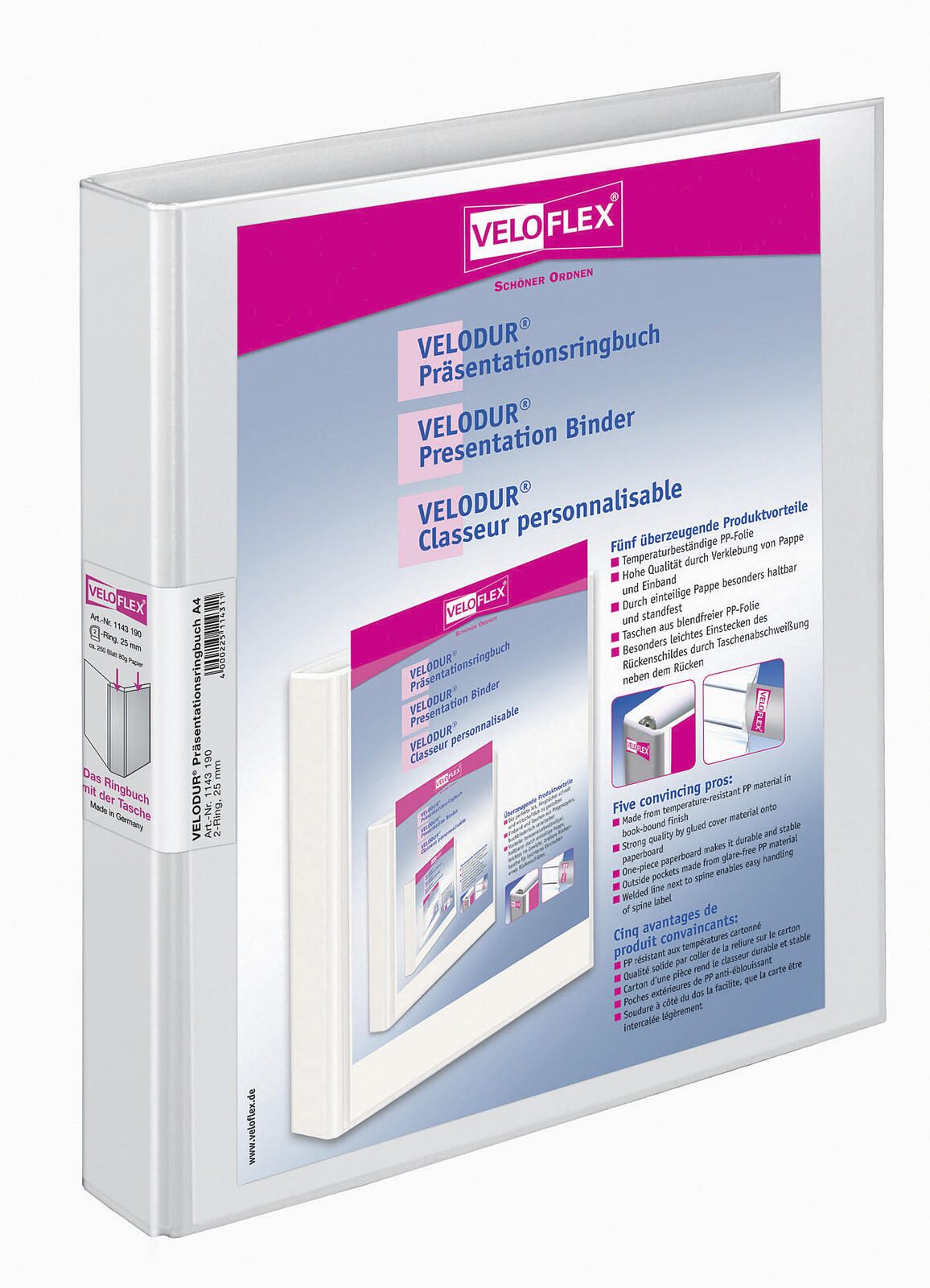 Die VELOFLEX Präsentationsringbücher bieten eine elegante und praktische Lösung für die Aufbewahrung und Präsentation von Dokumenten im DIN A4 Format. Mit einer Rückenbreite von 4 cm sind sie ideal für die Organisation von bis zu 250 Blatt Papier (80 g/m²), wodurch sie sich hervorragend für Berichte, Präsentationen oder Schulungsunterlagen eignen. Die ansprechende weiße Farbe verleiht deinem Arbeitsbereich ein professionelles Aussehen und sorgt dafür, dass deine Unterlagen stets gut zur Geltung kommen. Die innovative 4-D-Ring-Mechanik ermöglicht ein einfaches Abheften und Entnehmen von Dokumenten, während der einsteckbare Rückenschild eine individuelle Beschriftung erlaubt. So kannst du deine Präsentationsringbücher ganz nach deinen Wünschen gestalten und schnell erkennen, welches Dokument sich darin befindet. Die Verwendung von hochwertigem Kunststoff sorgt nicht nur für eine ansprechende Optik, sondern auch für eine hohe Langlebigkeit und Robustheit der Ringbücher. Die VELODUR® Serie steht für Qualität und Funktionalität, die den Anforderungen des modernen Büroalltags gerecht wird. Dank der Überbreite und dem durchdachten Design sind die Ringbücher besonders benutzerfreundlich, sodass du deine Dokumente problemlos organisieren und präsentieren kannst. Ob im Büro, in der Schule oder zu Hause, diese Präsentationsringbücher sind die perfekte Wahl, um deine Unterlagen stilvoll und übersichtlich aufzubewahren. Mit einer Packung von 10 Stück erhältst du gleich mehrere Ringbücher, die sich ideal für verschiedene Projekte oder zur Aufbewahrung von wichtigen Unterlagen eignen. Die Kombination aus Funktionalität, ansprechendem Design und der bewährten VELOFLEX Qualität macht diese Präsentationsringbücher zu einem unverzichtbaren Begleiter in deinem Alltag.Technische Daten