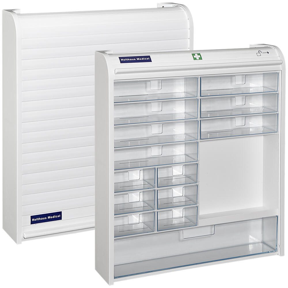 Der Holthaus Medical Medizinschrank Rollmed in Weiß ist universell einsetzbar und bietet praktischen Stauraum für medizinische Utensilien. Mit Maßen von 42,0 x 10,0 x 48,0 cm passt er in verschiedene Räume und Umgebungen.