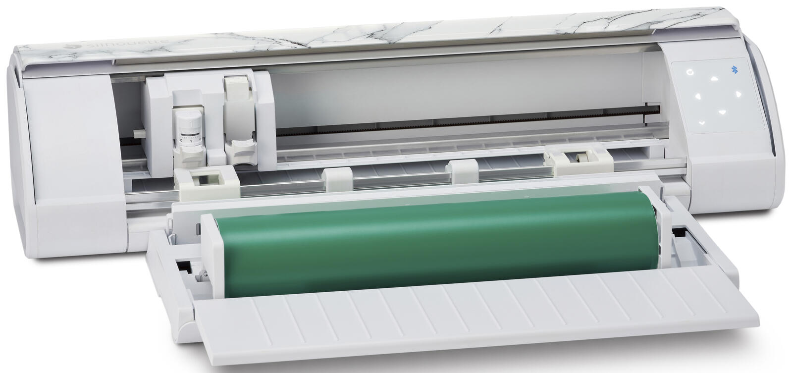 Der SILHOUETTE CAMEO5 bietet zudem Komforteigenschaften wie frei verstellbare Andruckrollen, ein elektrostatisches Bett, die Möglichkeit zur mehrlagigen Verarbeitung und eine automatische Werkzeugerkennung. Im Lieferumfang sind neben dem Gerät verschiedene praktische Zubehörteile enthalten, darunter ein USB-Kabel, Rollenhalter, Schnittadapter, Tiefschnitt-Schneideadapter, Stift-Adapter und Kraft-Schnittadapter. Die Farbe des Geräts wird als „Bianco Carara“ beschrieben.