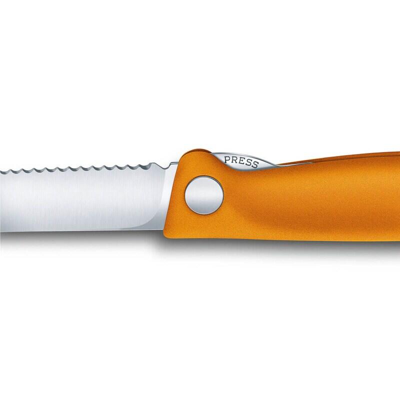 Der Griff des Messers ist aus Kunststoff gefertigt und in den Farben Silber und Orange gestaltet, was für eine ansprechende Optik sorgt. Das Messer ist klappbar und spülmaschinengeeignet, was die Handhabung und Reinigung erleichtert. Diese Eigenschaften machen es zu einem vielseitigen Küchenhelfer, der sich gut in jede Besteckausstattung integriert.