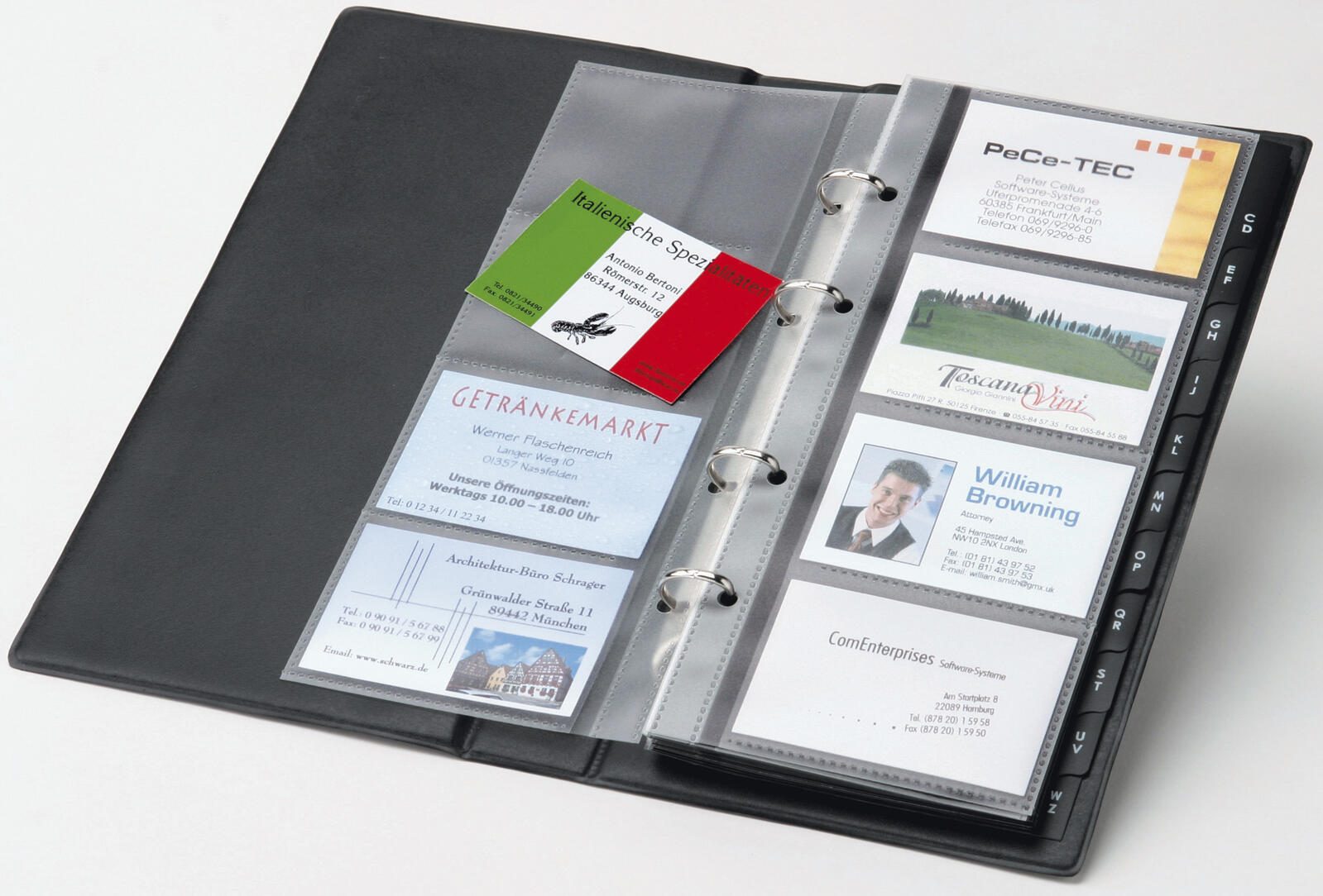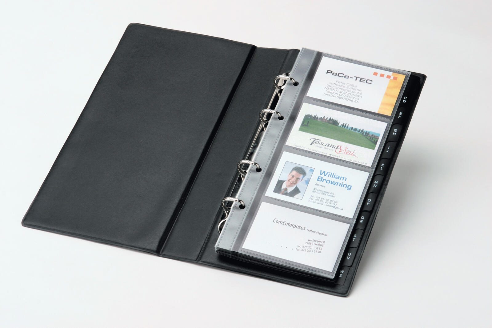 Dank seiner 4-Rund-Ring-Mechanik können bis zu 200 Visitenkarten sicher und ordentlich verwahrt werden. Die 12-teilige Teilung und die alphabetische A-Z Taben sorgen dafür, dass du deine Kontakte mühelos finden kannst, ohne wertvolle Zeit mit dem Suchen zu verlieren. Das strapazierfähige Kunststoffmaterial gewährleistet eine lange Lebensdauer und schützt deine Visitenkarten vor Beschädigungen.