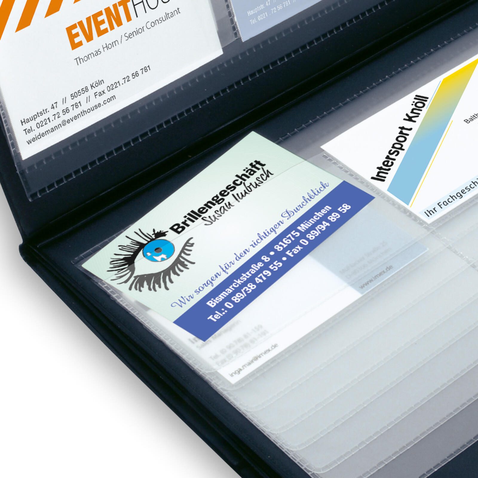 Die Visitenkartenmappe zeichnet sich durch ihr hochwertiges Material aus Kunststoff aus, das für Langlebigkeit und Schutz deiner Visitenkarten sorgt. Das schlichte Schwarz verleiht der Mappe ein elegantes Aussehen, das zu jedem Büro- oder Geschäftssetting passt.