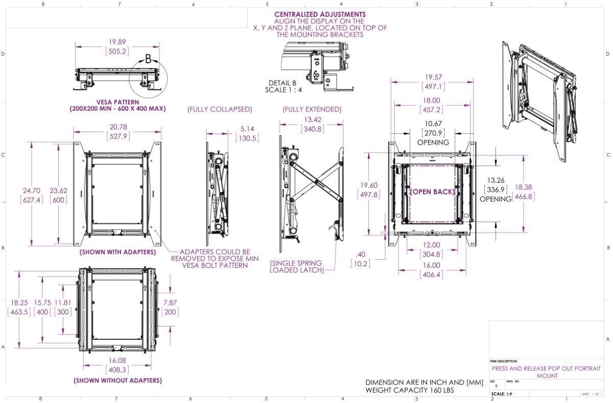 Die einstellbare PFW 6875 Pop-out-Videowandmodule ist speziell für Befestigung der Bildschirme in Hochformat geeignet. Die PFW 6875 ist für Bildschirme bis 72 kg gedacht und mit einem Befestigungsbereich von 200 x 200 bis zu 500 x 600 mm. Zu seinen
