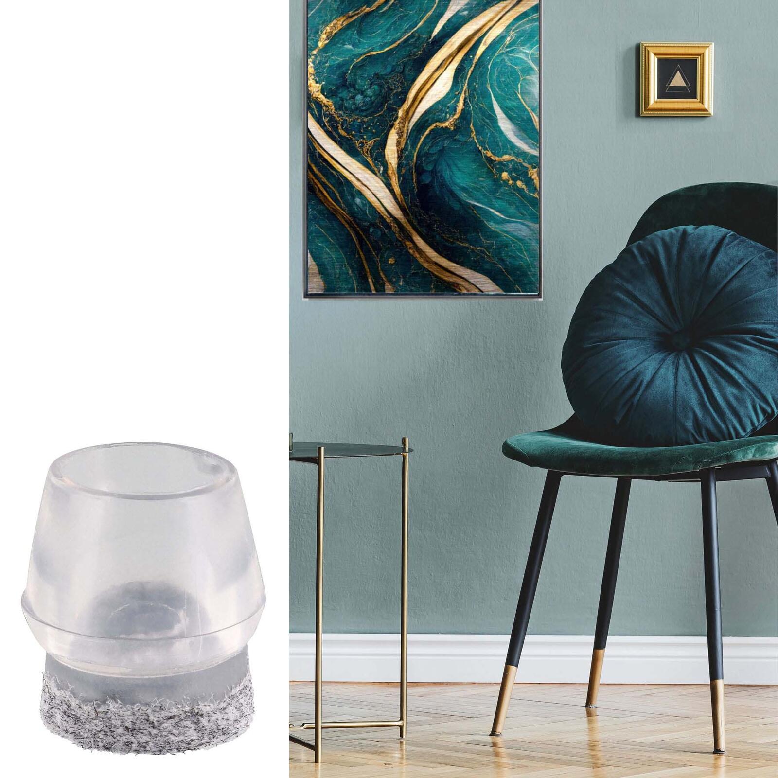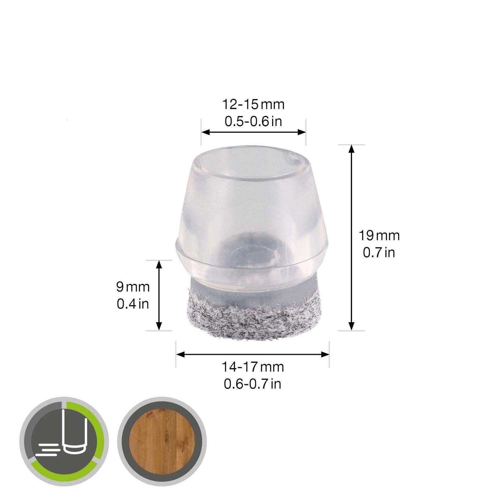 Die Kappen haben einen Durchmesser von 1,4 bis 1,7 cm und eine Höhe von 1,9 cm. Sie sind transparent gehalten, wodurch sie sich unauffällig an verschiedene Stuhlgestelle anpassen lassen. Verpackt sind die Stuhlbeinkappen in einer Packung mit vier Stück, was eine einfache und praktische Nachrüstung oder Erneuerung ermöglicht.