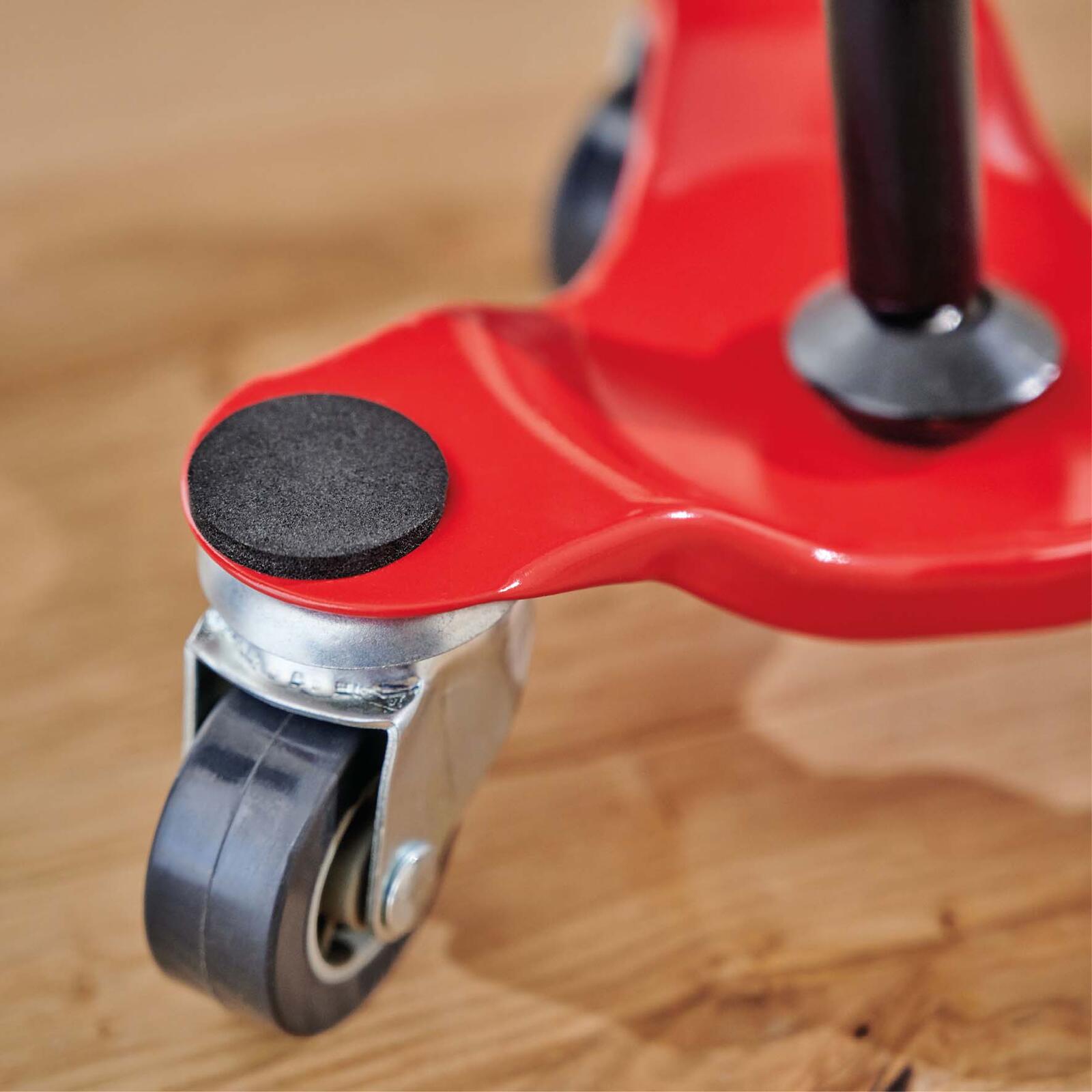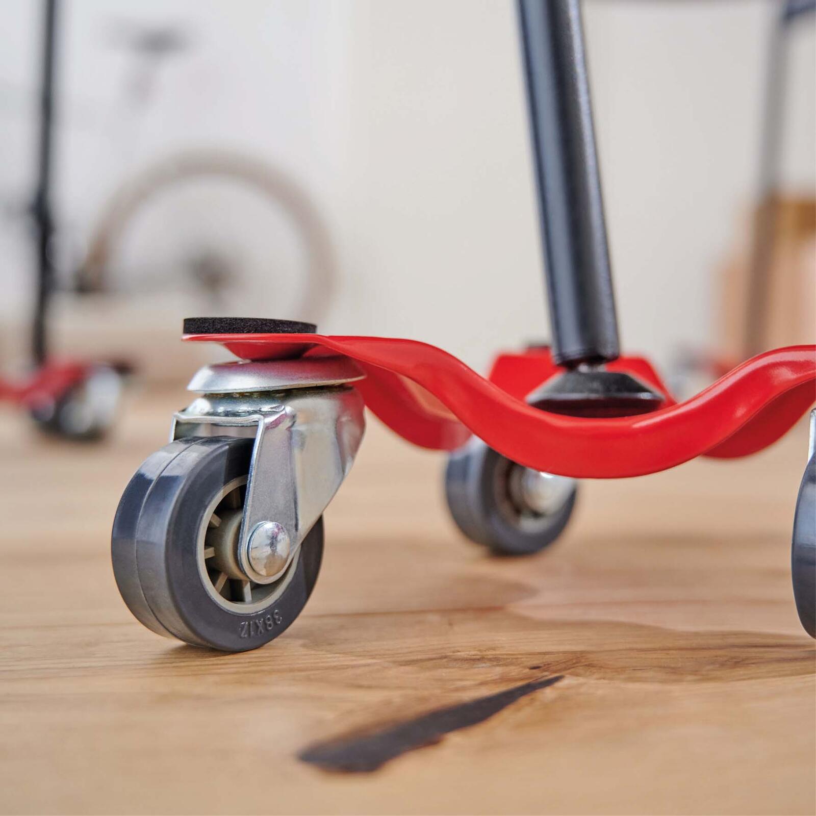 Ausgestattet ist der Transportroller mit drei wendigen Softlenkrollen, die eine flexible und leichtgängige Bewegung in alle Richtungen ermöglichen. Diese Rollen sind so konzipiert, dass sie den Boden schonen und gleichzeitig eine hohe Belastbarkeit gewährleisten. Dadurch lässt sich der Transportroller auch auf empfindlichen Böden ohne Beschädigung verwenden.