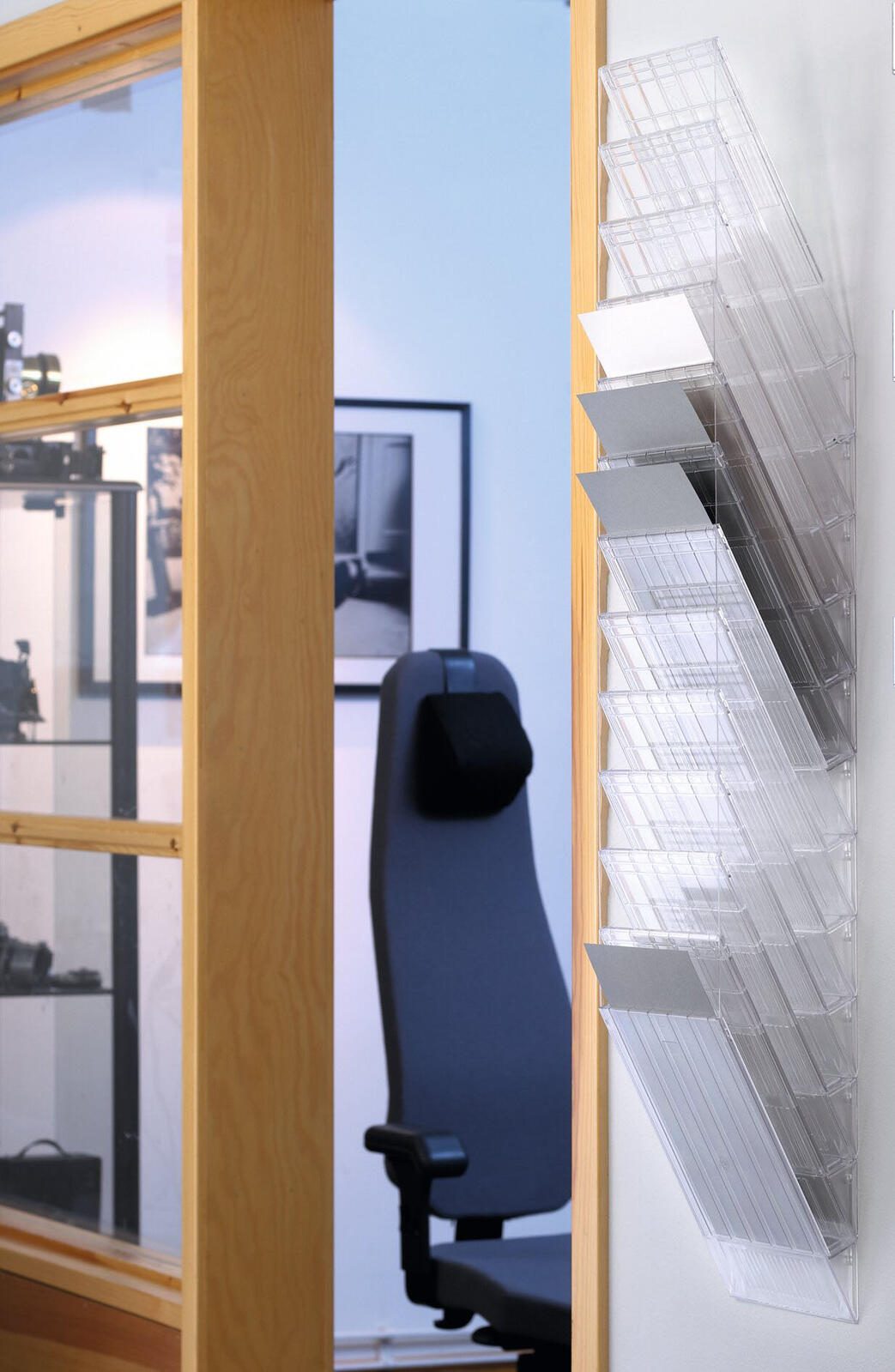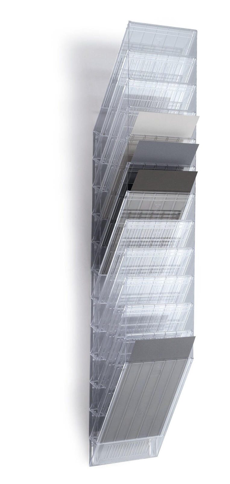 Der DURABLE Wandprospekthalter Wand-Prospekt.12xA4 Flexi.L.Tr ist die ideale Lösung für deine Dokumentenaufbewahrung im Innenbereich. Mit insgesamt 12 Fächern bietet dieser Prospekthalter aus transparentem Polystyrol genügend Platz, um deine DIN A4-Dokumente übersichtlich zu präsentieren.