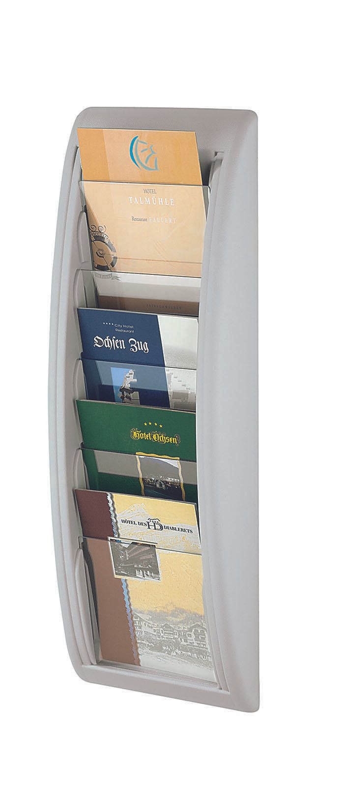 Der Wandprospekthalter verfügt über 5 Fächer aus hochwertigem Polystyrol, die speziell für Formate bis A5 geeignet sind. In dem zeitlosen Farbton grau fügt sich der Wandprospekthalter harmonisch in jedes Raumkonzept ein.