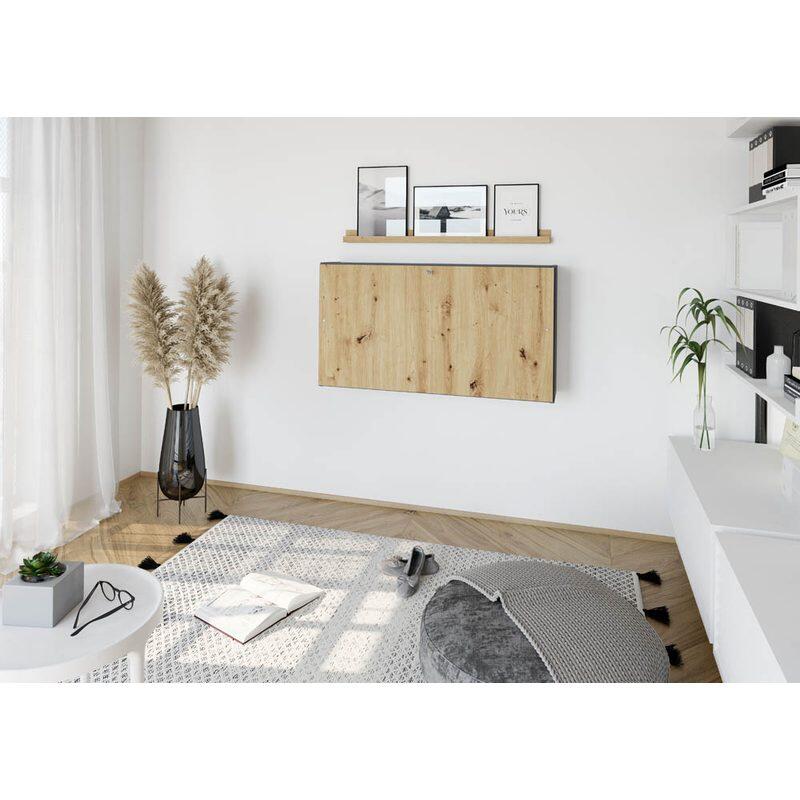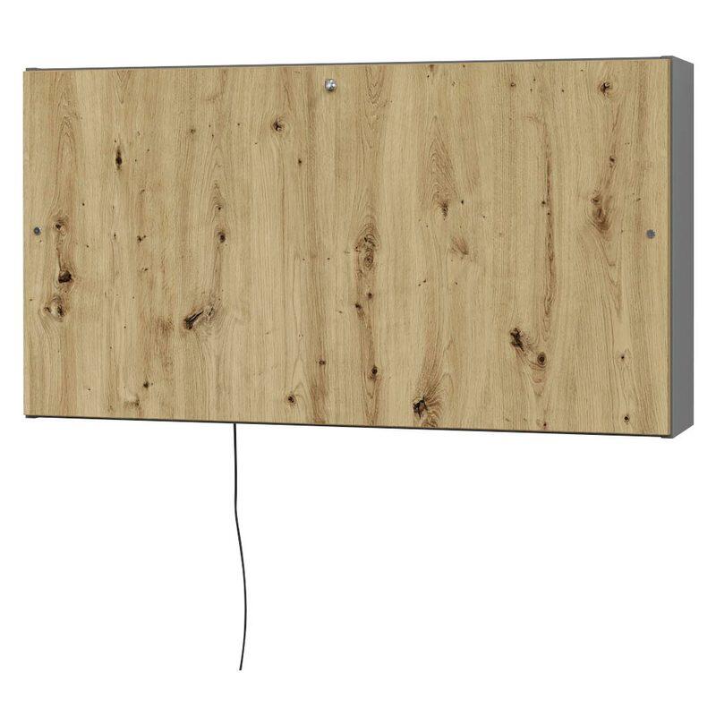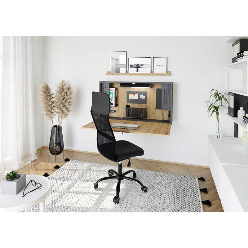Der HAMMERBACHER Wandschreibtisch VWO12/G/R in der eleganten Farbgebung grafit und asteiche vereint Funktionalität mit modernem Design. Die Tischplatte besteht aus robuster Spanplatte, die nicht nur langlebig ist, sondern auch eine ansprechende Optik bietet. Mit einer Größe von 120 cm Breite, 24 cm Tiefe und 65 cm Höhe fügt sich dieser Wandschreibtisch harmonisch in verschiedene Raumkonzepte ein, sei es im Homeoffice, im Jugendzimmer oder in einem kreativen Arbeitsbereich. Ein besonderes Merkmal dieses Wandschreibtisches ist die integrierte LED-Leuchte, die für eine optimale Ausleuchtung sorgt und somit das Arbeiten auch bei schwachem Licht angenehm gestaltet. Die Klappe des Schreibtisches ist abschließbar, was zusätzlichen Stauraum für persönliche Gegenstände oder wichtige Unterlagen bietet und somit für Sicherheit sorgt. Die Kombination aus grafit und asteiche verleiht dem Wandschreibtisch eine moderne und zugleich warme Ausstrahlung, die jeden Raum aufwertet. Der hängende Aufbau des Gestells ermöglicht eine platzsparende Nutzung, während die schlichte Eleganz des Designs vielseitige Dekorationsmöglichkeiten bietet. Dieser Wandschreibtisch ist nicht nur praktisch, sondern auch ein stilvolles Möbelstück, das sich nahtlos in Ihr Zuhause integriert. Er bietet Ihnen die ideale Grundlage für produktives Arbeiten und kreative Entfaltung, während er gleichzeitig den Raum optisch nicht überlädt. Der HAMMERBACHER Wandschreibtisch VWO12/G/R ist die perfekte Wahl für alle, die Wert auf Qualität und Design legen.Technische Daten