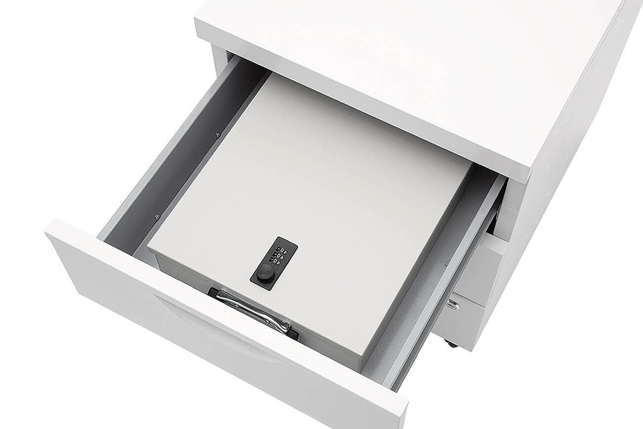 Die WEDO Dokumentenkassette DIN A4 aus hochwertigem Stahlblech ist die ideale Lösung zur sicheren Aufbewahrung Ihrer wichtigen Unterlagen. Mit einem praktischen Tragegriff ausgestattet, ermöglicht sie Ihnen eine komfortable Handhabung und einen einfachen Transport. Die Kassette ist speziell für das Format DIN A4 konzipiert und bietet ausreichend Platz für Ihre Dokumente, Verträge oder andere wichtige Papiere. Mit den kompakten Maßen von 26,0 x 35,5 x 6,7 cm passt die Kassette mühelos in jede Schublade oder auf Regale und sorgt so für Ordnung in Ihrem Büro oder Zuhause. Die lichtgraue Farbe verleiht der Kassette ein modernes und ansprechendes Design, das sich harmonisch in verschiedene Einrichtungsstile einfügt. Ein weiteres praktisches Merkmal sind die zwei Bohrlöcher im Boden, die eine feste Befestigung in der Schublade ermöglichen. Dies sorgt nicht nur für zusätzliche Sicherheit, sondern verhindert auch ein Verrutschen der Kassette beim Öffnen und Schließen. Die Verwendung von robustem Stahlblech gewährleistet eine hohe Langlebigkeit und Widerstandsfähigkeit, sodass Ihre Dokumente optimal geschützt sind. Egal, ob für den privaten Gebrauch oder im professionellen Umfeld, die WEDO Dokumentenkassette DIN A4 ist eine zuverlässige Wahl für alle, die Wert auf Sicherheit und Ordnung legen.Technische Daten