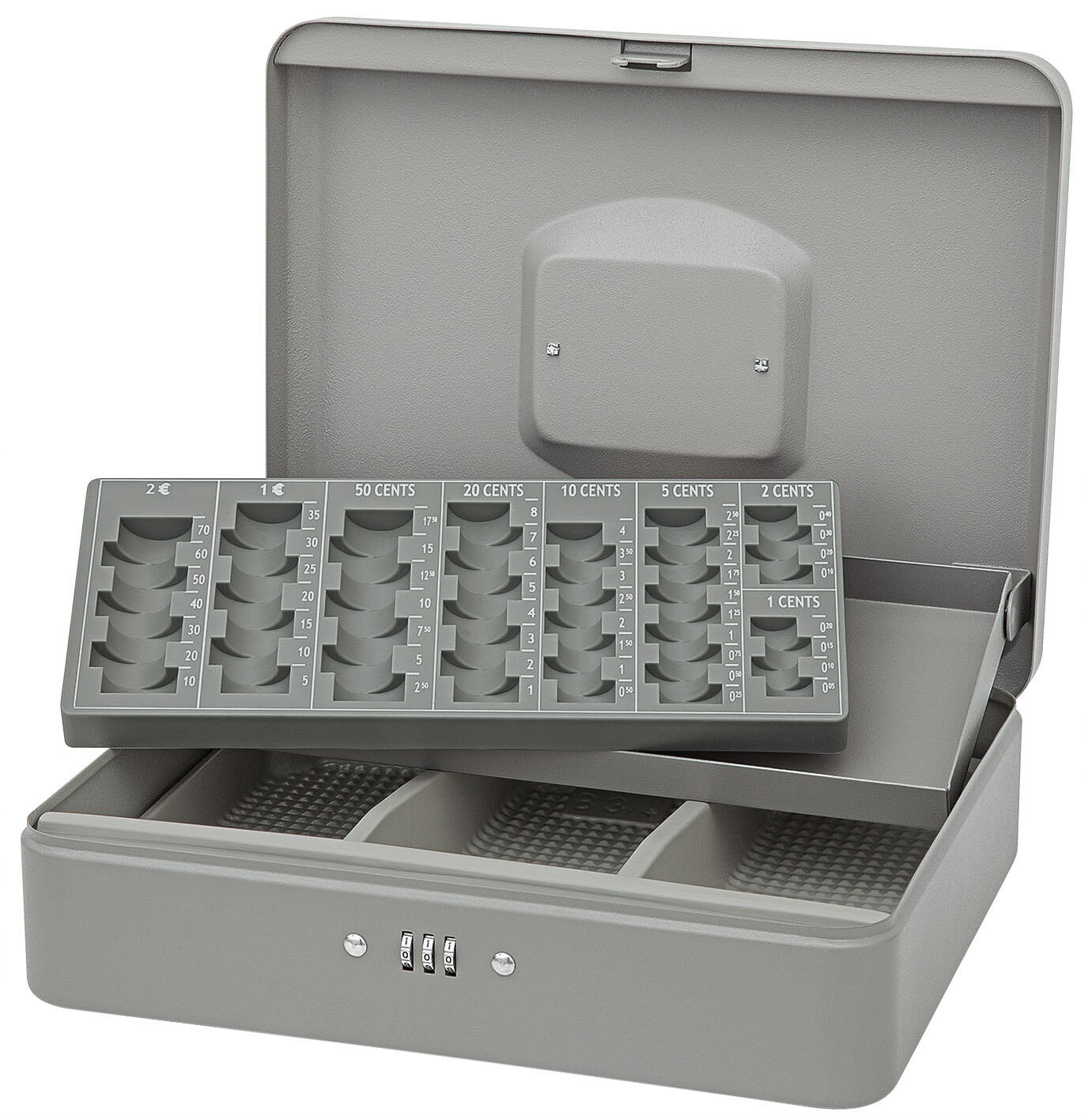 Die Geldkassette verfügt über einen herausnehmbaren Einsatz sowie ein Münzzählbrett, was dir das Sortieren und Zählen deiner Münzen erleichtert. Mit den Maßen von 30,0 x 24,0 x 9,0 cm bietet sie ausreichend Platz für deine Geldscheine und Münzen. Der graue Farbton verleiht der Kassette ein klassisches und unauffälliges Aussehen.