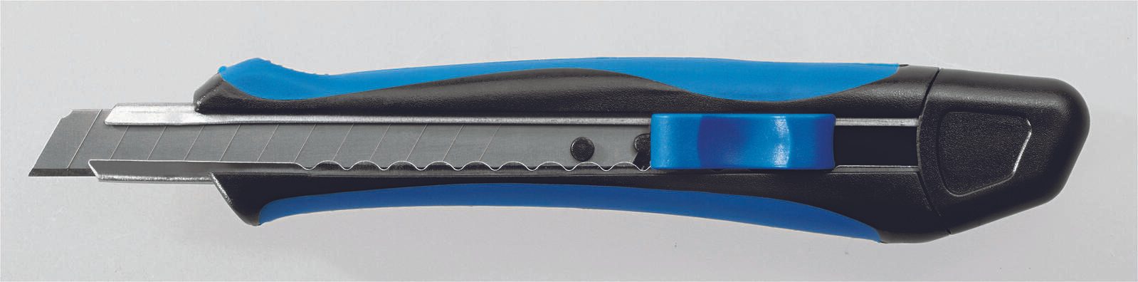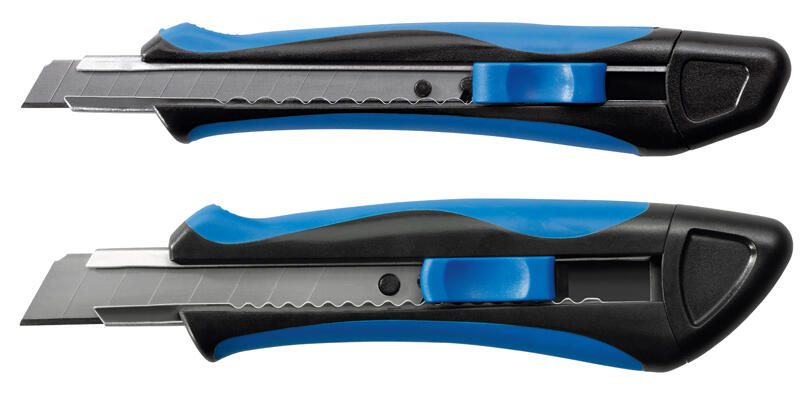 Die Klingenführung des Soft-Cutters erfolgt durch eine Rasterautomatik, die ein einfaches und sicheres Handling gewährleistet. Der Griff des Messers ist gummiert, was einen komfortablen und rutschfesten Halt ermöglicht, selbst bei längeren Schneidevorgängen. Durch die Kombination der Farben blau und schwarz ist das Cuttermesser nicht nur ein praktisches Werkzeug, sondern auch ein optisches Highlight in deiner Werkstatt oder Büro.