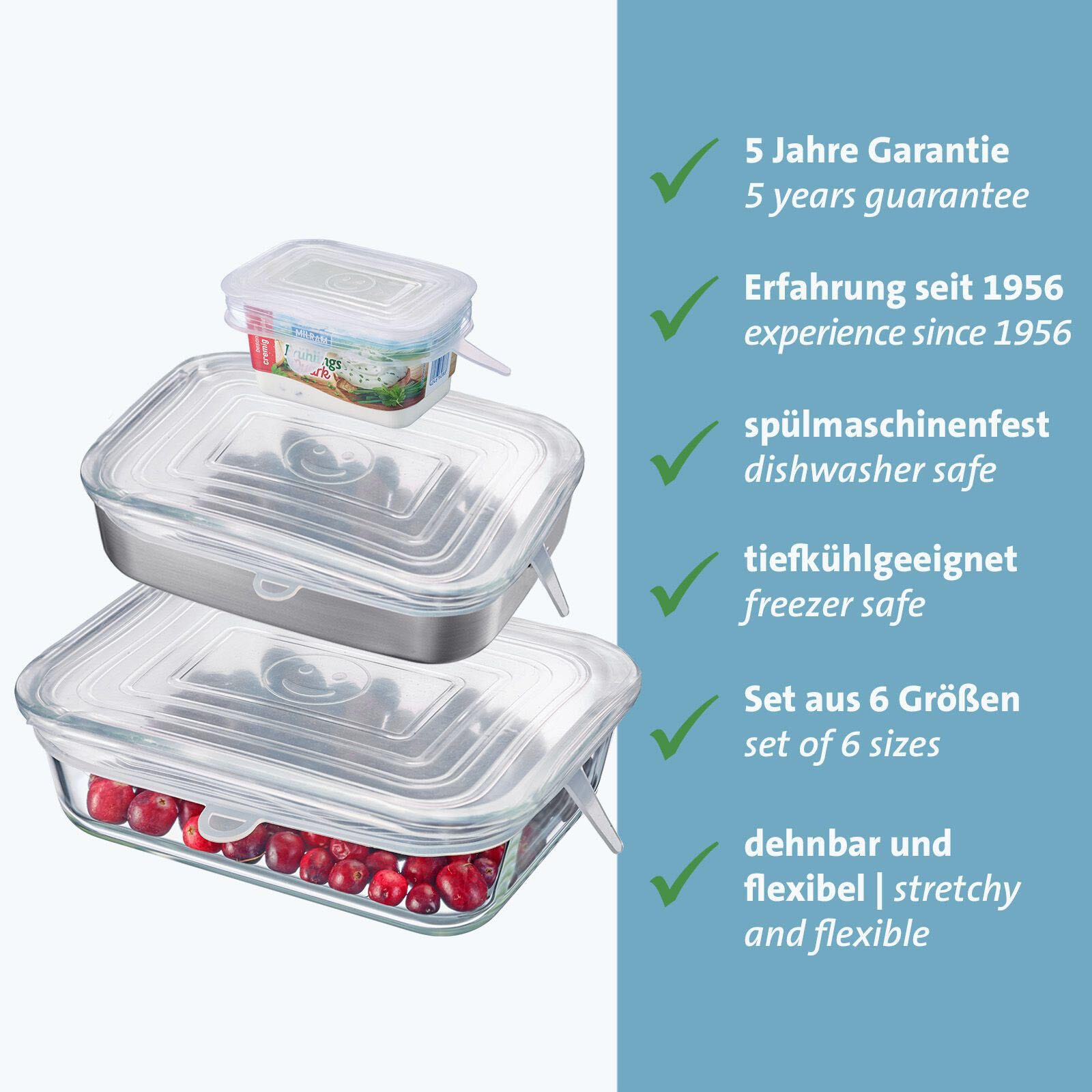 Das WESTMARK Frischhaltedeckel-Set ist ideal für eine Vielzahl von Behältern, egal ob es sich um Schalen, Töpfe oder sogar Gläser handelt. Die vielseitige Anwendung macht dieses Set zu einem unverzichtbaren Helfer in deiner Küche. Die Serie "Square" steht für modernes Design und Funktionalität, sodass du nicht nur praktisch, sondern auch stilvoll aufbewahren kannst.