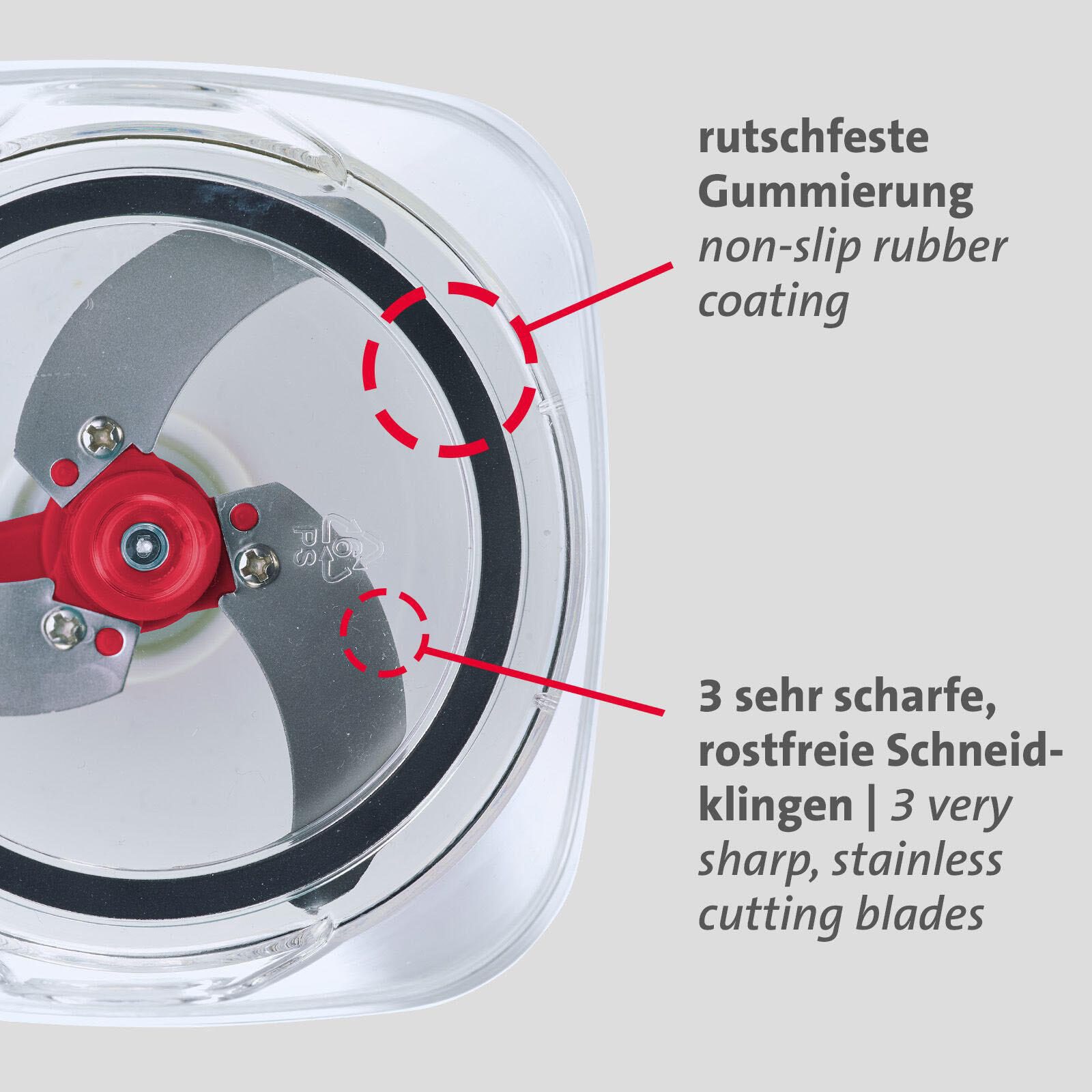 Der WESTMARK 11612260 Zerkleinerer ist ein unverzichtbares Küchenutensil, das dir hilft, deine Zutaten schnell und effizient zu verarbeiten. Hergestellt aus hochwertigem Kunststoff, bietet dieser Zerkleinerer nicht nur Langlebigkeit, sondern auch einfache Handhabung und Pflege. Die ansprechende Farbkombination in Weiß und Rot verleiht deiner Küche einen modernen Akzent und sorgt dafür, dass der Zerkleinerer nicht nur funktional, sondern auch ästhetisch ansprechend ist. Mit einem großzügigen Fassungsvermögen von 450 ml ist der WESTMARK Zerkleinerer ideal für die Zubereitung von kleinen bis mittleren Mengen an Obst, Gemüse, Nüssen und Kräutern. Egal, ob du eine schnelle Salsa, einen frischen Salat oder eine aromatische Gewürzmischung zubereiten möchtest, dieser Zerkleinerer macht es dir leicht. Durch die einfache Bedienung kannst du in kürzester Zeit gesunde und schmackhafte Zutaten für deine Gerichte zubereiten. Die Verwendung des WESTMARK Zerkleinerers ist denkbar unkompliziert. Du musst lediglich die gewünschten Zutaten in den Behälter geben, den Deckel aufsetzen und die Handkurbel betätigen. Die scharfen Klingen zerkleinern die Lebensmittel gleichmäßig, sodass du stets die perfekte Konsistenz erreichst. Dies spart nicht nur Zeit, sondern auch Energie, da du keine elektrischen Geräte verwenden musst. Der WESTMARK 11612260 Zerkleinerer eignet sich hervorragend für alle, die Wert auf frische und gesunde Ernährung legen. Durch die manuelle Bedienung behältst du die Kontrolle über den Zerkleinerungsprozess und kannst die Größe der Stücke nach deinen Wünschen anpassen. Zudem ist der Zerkleinerer leicht zu reinigen, was ihn zu einem praktischen Begleiter in deiner Küche macht. Entdecke die Vorteile des WESTMARK 11612260 Zerkleinerers und bereichere deine Kochkünste mit diesem vielseitigen Küchenhelfer.Technische Daten