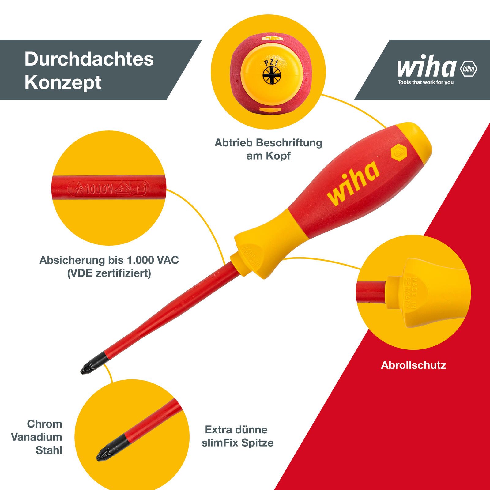 Das Set beinhaltet sowohl Schlitz- als auch Kreuzschlitzschraubendreher (PZ), wodurch es vielseitig einsetzbar ist und eine breite Palette von Schraubprofilen abdeckt. Die Größen reichen von 3,5 x 100 mm bis 6,5 x 150 mm bei den Schlitzschraubendrehern sowie PZ 1 x 80 mm und PZ 2 x 100 mm, was eine präzise Anpassung an unterschiedliche Schrauben ermöglicht. Dank der slimFix-Technologie sind die Klingen schmal gestaltet, was das Arbeiten an schwer zugänglichen Stellen erleichtert und gleichzeitig die elektrische Isolierung unterstützt.