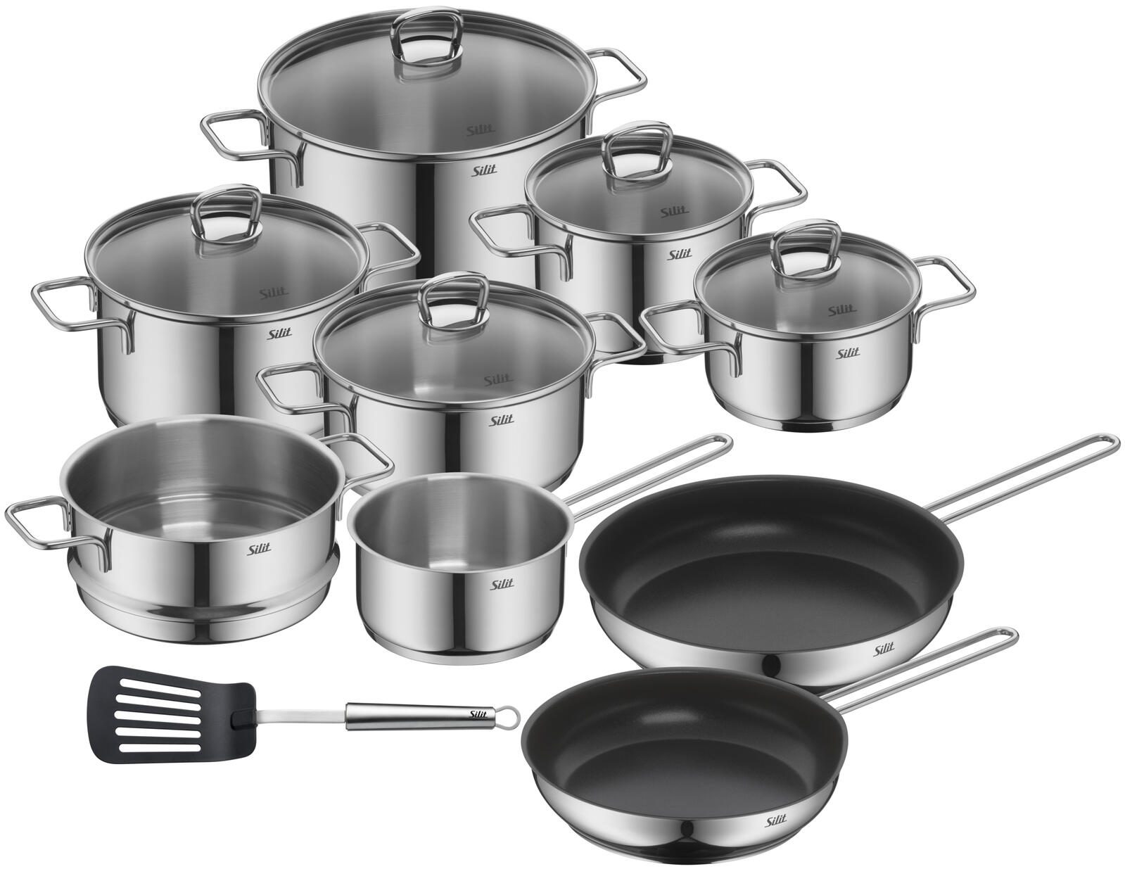 - Setumfang: 2x Bratentopf mit Deckel, 3x Fleischtopf mit Deckel, 1x Stielkasserolle ohne Deckel, 1x Dampfeinsatz, 2x Bratpfanne, 1x Pfannenwender