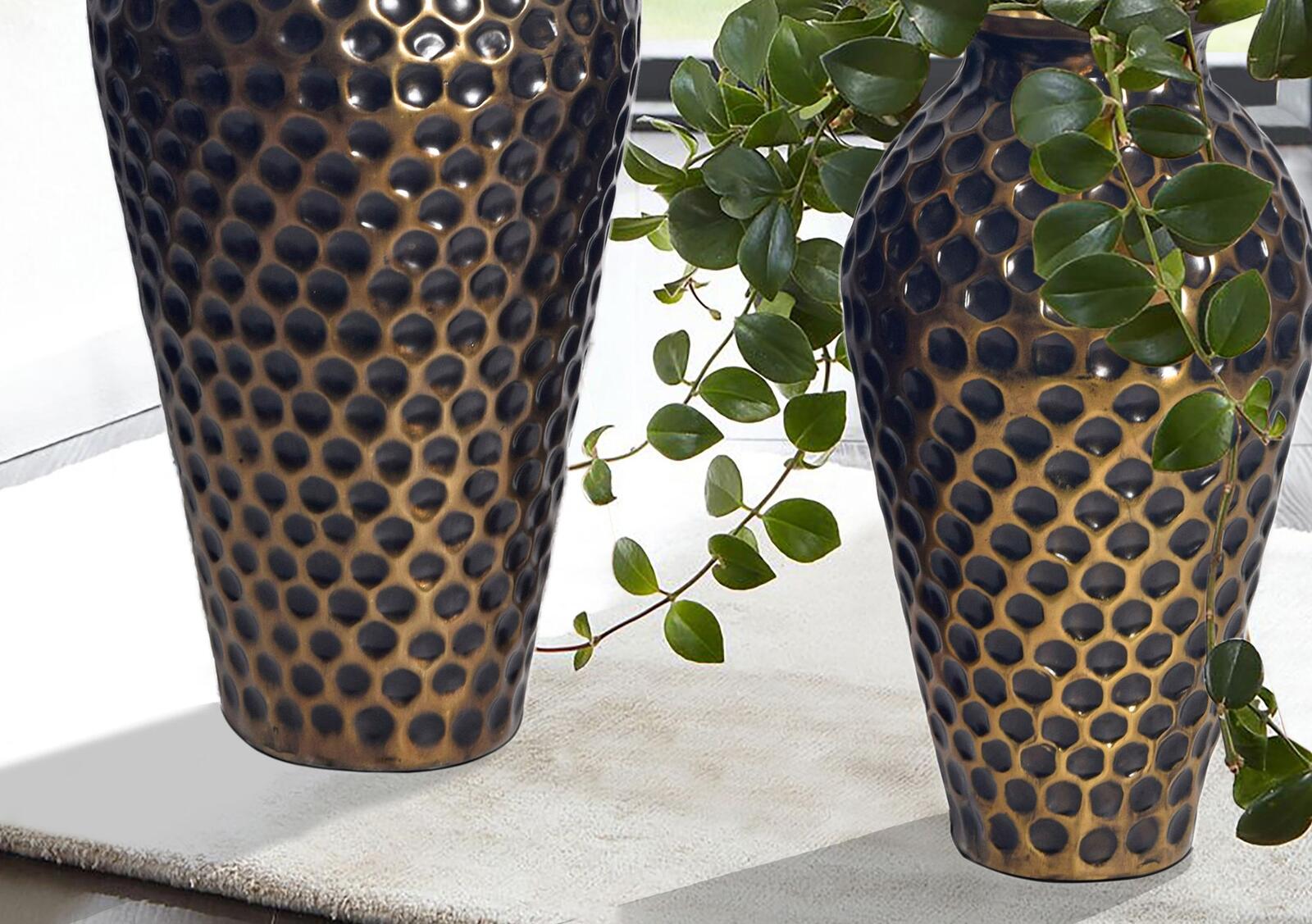 - Beide Dekovasen bestehen aus massivem Aluminium, welches goldfarben lackiert sind.