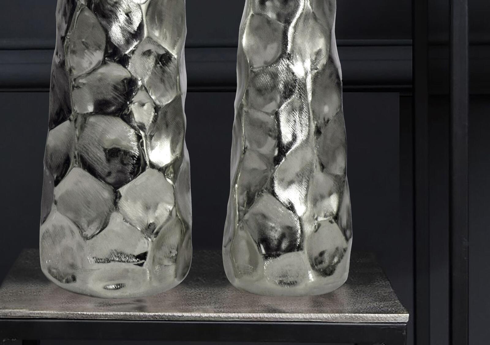 Das WOHNLING WL7.182 Vasen 2er Set in Silber vereint zeitloses Design mit hochwertiger Handwerkskunst. Die beiden Vasen sind aus massivem, gebürstetem Aluminium gefertigt und mit einer silberfarbenen Lackierung versehen, die ihnen eine elegante und moderne Optik verleiht. Besonders auffällig ist die gebürstete und texturierte Hammerschlag-Oberfläche, die den Vasen eine individuelle und edle Note verleiht und sie zu einem stilvollen Blickfang in jedem Raum macht.