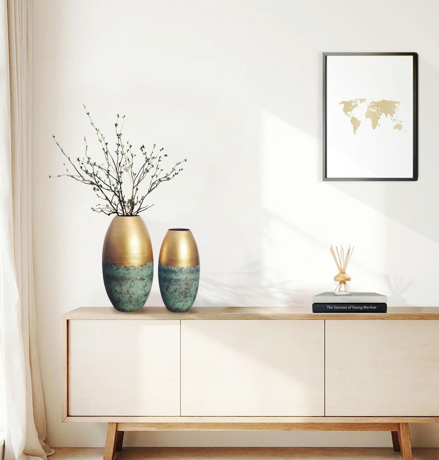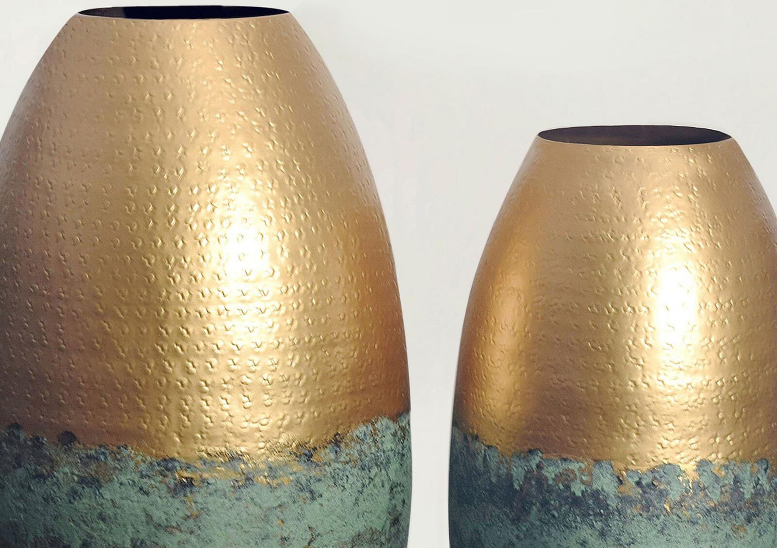 - Diese Metallvasen bestechen durch die kunstvolle Zweifarbigkeit mit glänzendem Gold und patiniertem Türkisgrün. Die filigrane Punzierung verleiht den bauchigen Gefäßen eine edle Optik – perfekt als stilvolles Wohnaccessoire.