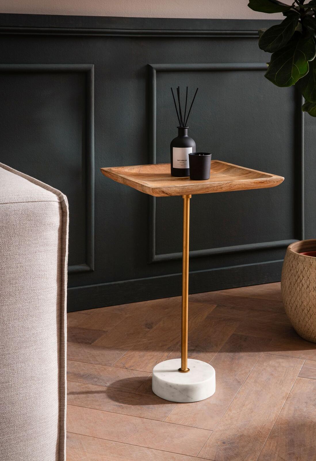 - Ein moderner Hingucker mit zeitlosem Charme – dieser Beistelltisch besticht durch seine quadratische Massivholzplatte, die auf einem schlanken, goldfarbenen Metallgestell ruht. Der schwere Marmorsockel sorgt für Stabilität und eine edle Note.