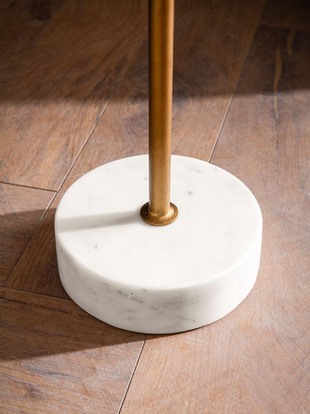 Mit den Maßen von 35 x 35 cm in Breite und Tiefe sowie einer Höhe von 55 cm fügt sich dieser Beistelltisch harmonisch in verschiedenste Wohnkonzepte ein. Die Tischplattenstärke beträgt ca. 1,5 cm, der Marmorsockel hat einen Durchmesser von 16 cm, was dem Möbelstück eine solide Basis verleiht. Die Kombination aus warmem Holz, glänzendem Metall und kühlem Marmor erzeugt eine spannende Materialvielfalt, die sowohl optisch als auch haptisch überzeugt.