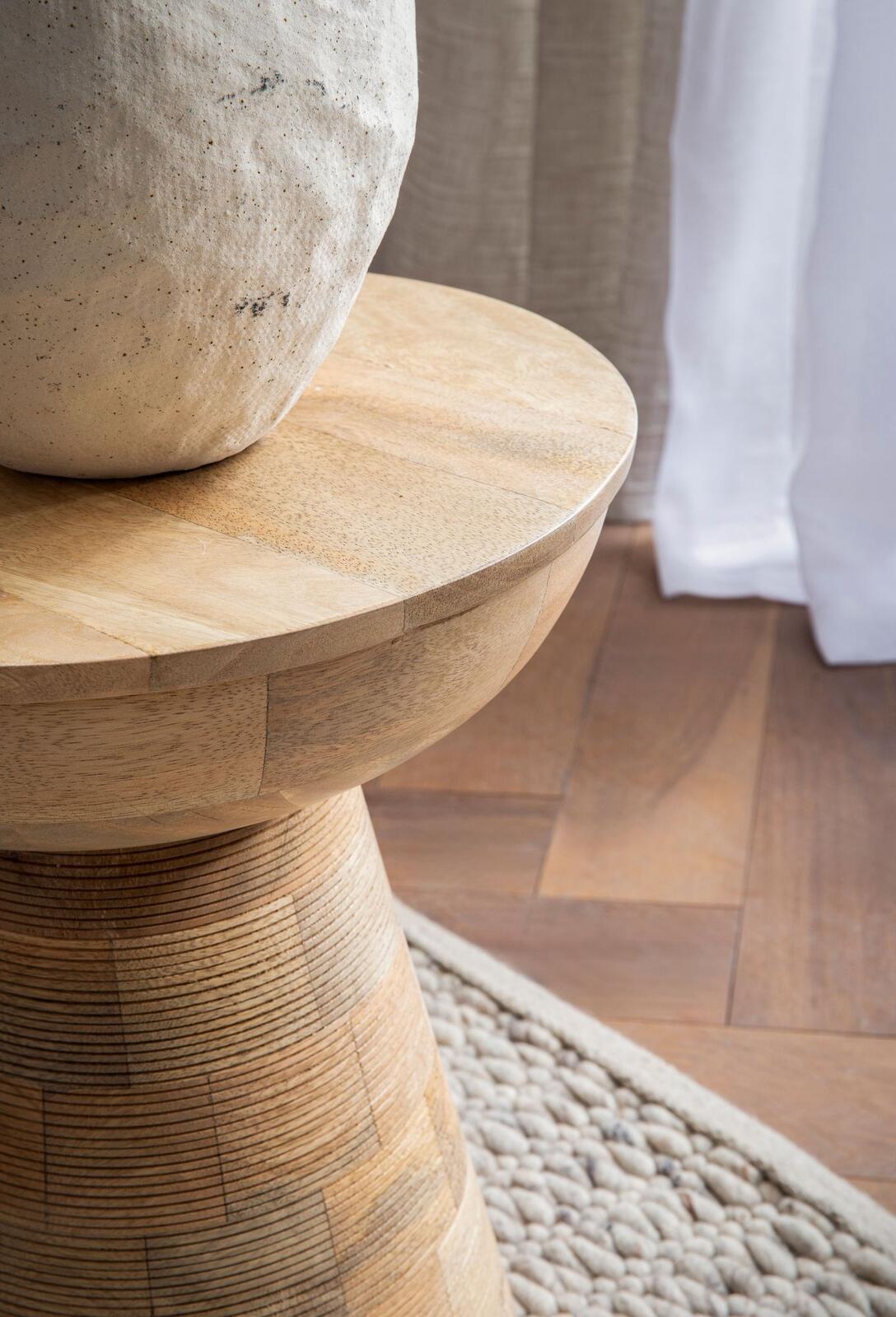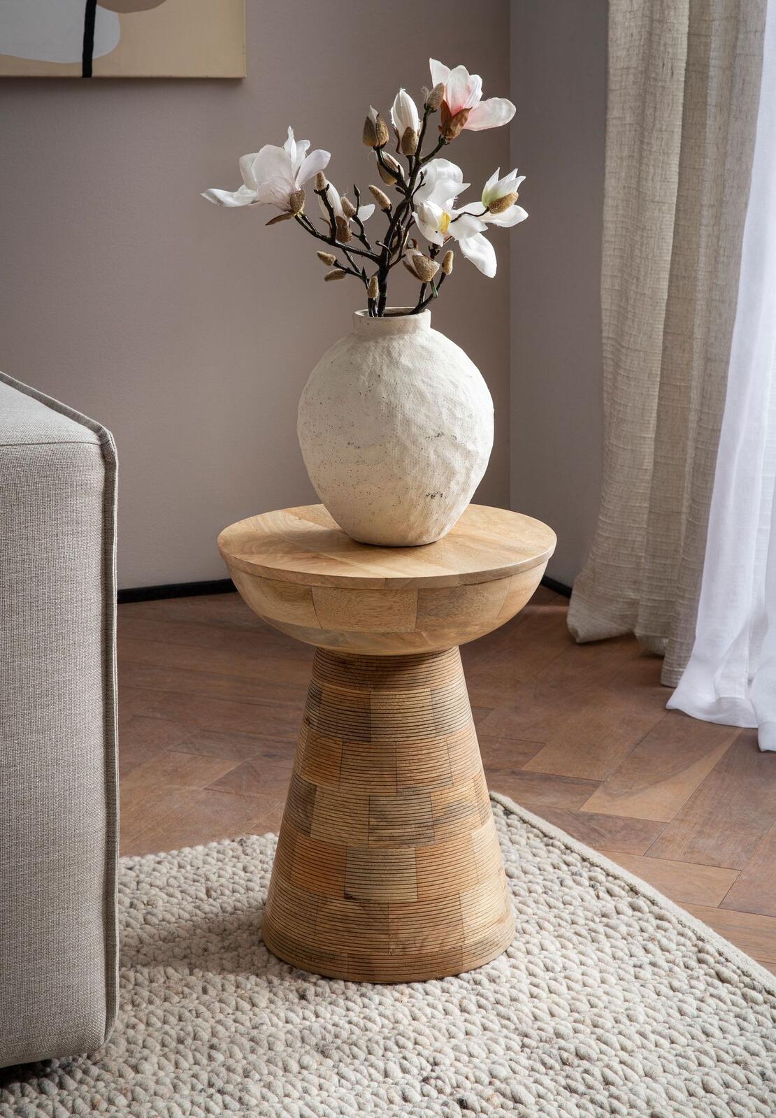 Der WOHNLING WL7.307 Beistelltisch überzeugt durch seine natürliche Ausstrahlung und hochwertige Verarbeitung aus massivem Mango-Holz. Das naturgebleichte Holz verleiht dem Tisch eine helle, freundliche Optik, die jedem Raum eine warme und gemütliche Atmosphäre schenkt. Die Oberfläche ist mit einem schützenden Klarlack versehen, der das Holz nachhaltig schützt und gleichzeitig seine natürliche Maserung hervorhebt.