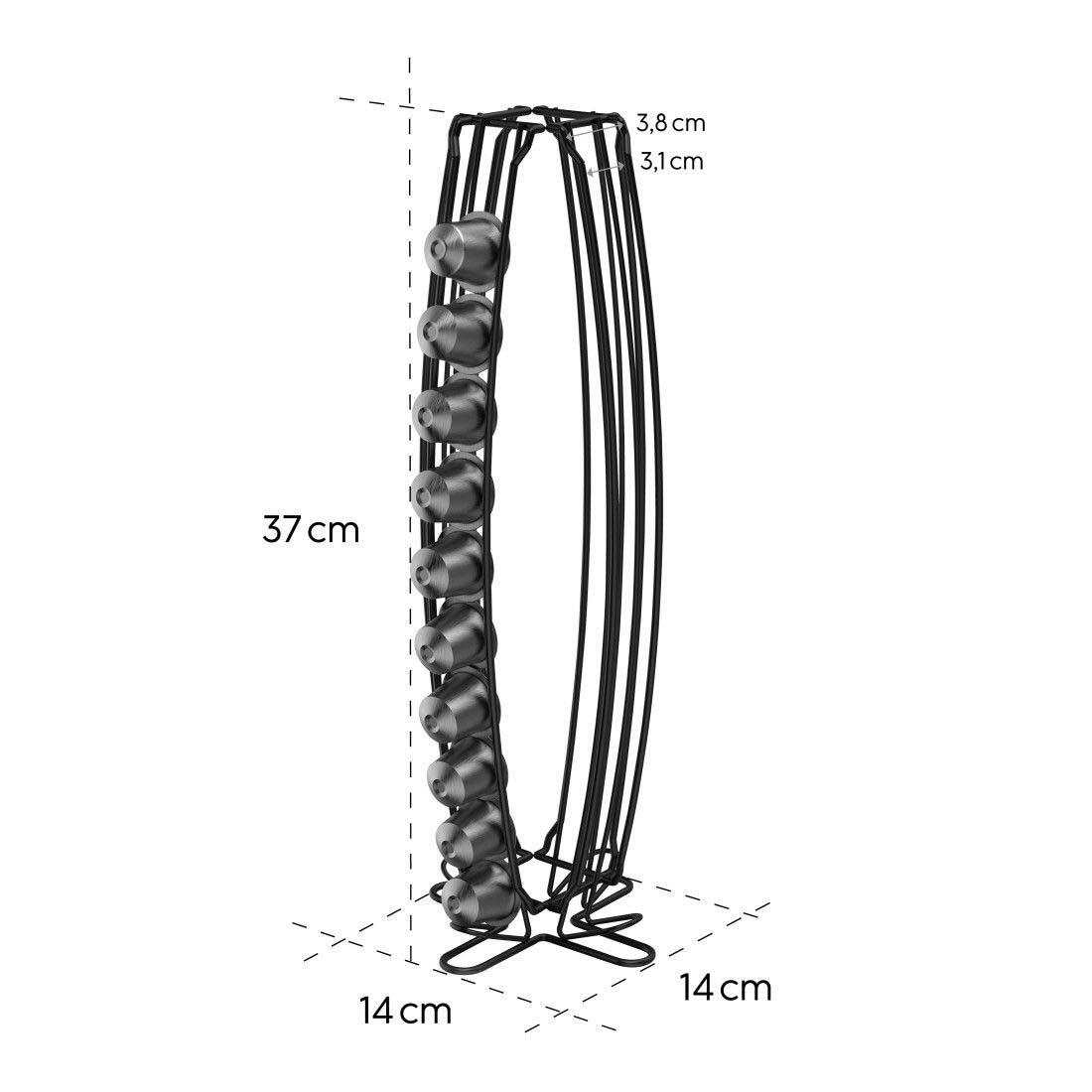 Der xavax® Kapselspender Barista in der Farbe Schwarz ist ein praktisches Küchenutensil, das speziell für die Aufbewahrung von Kaffeekapseln entwickelt wurde. Er besteht aus robustem Metall, was für eine stabile und langlebige Nutzung sorgt. Mit seinen kompakten Maßen von 14 x 37 x 14 cm (Breite x Höhe x Tiefe) findet der Spender auch in kleineren Küchen Platz.