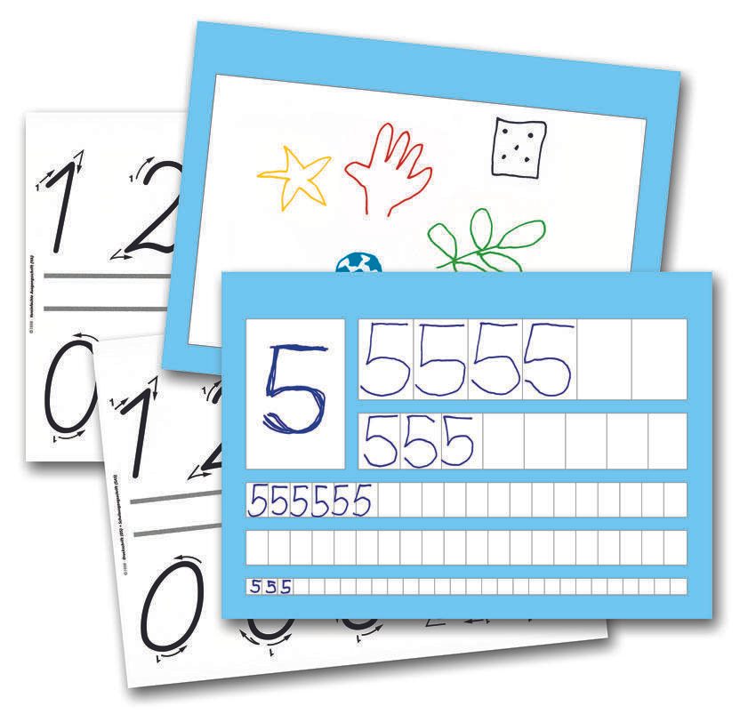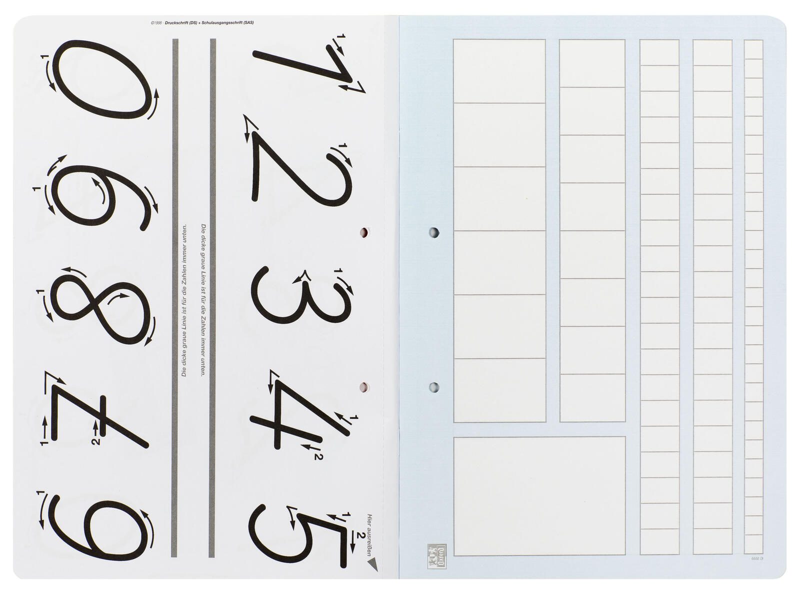 - Besonerheiten: Spurzahlen mit Richtungspfeilen als Vorlagen, farbig hinterlegte Lineatur, Freiraum für Schwungübungen