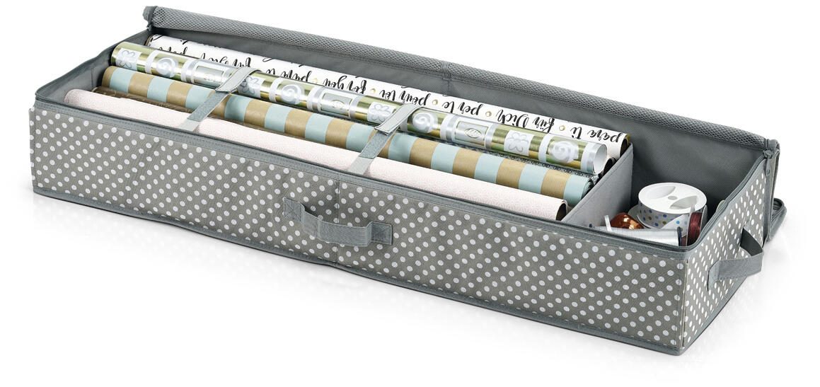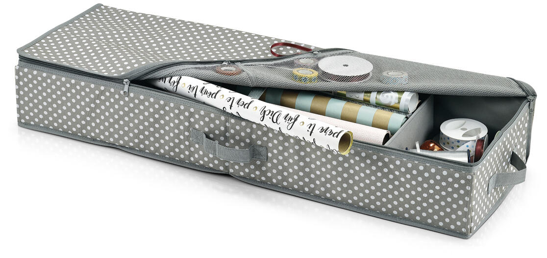 - Besonderheiten: Platz für bis zu 20 Geschenkpapier-Rollen, zusätzlich 2 Fächer zur Aufbewahrung von Verpackungsutensilien, Aufhänglaschen und Griff ermöglichen einfachen Transport